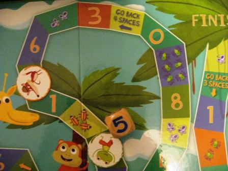 The Number Hunt game is a really cute way to introduce counting, addition and subtraction while having fun with your child. The slogan of this game is to ‘add your way through the jungle’. This is a 2 to 4 person board and dice game with the goal of navigating your way from start to finish through a line of numbered squares. The single die is wooden and labeled with the numbers 0-5. My favorite part is that you either land on a space with a number or a certain number of bugs and you must either count or say the number of that space. By adding up the die with the numbered space you get to move forward on each turn. Watch out because there are ‘skip a turn’ or ‘go back’ (subtract) spaces that can hinder your route. First one to the finish is the victor! An added bonus is that this is an eco-friendly game. The entire game is printed with vegetable ink on recycled paper. A definite fun filled learning game about numbers for the entire family.