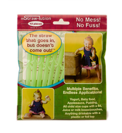 Chalk this up to another product I wish I had invented. This is another local product from a Cedar Park, TX Momma who came up with the perfect solution for those on-the-go snacks that only a parent with young ones would think about. I have a young one, so I think about this stuff a lot! Jamie’s straw idea seemed so simple that I knew it just had to work – and we tried it – and it does! Okay, here it is – The Straw-lution Straw is a basic straw with – ta da! – four little prongs (or whatever you would call them – sticky-outty things) towards the end of the straw that hold the straw in place in the container. Yes, it is that simple. It’s a great length (five inches) for kid cups (you know the size of the ones they give you at restaurants) and individual containers of food where you could fit the straws like in yogurt containers or applesauce. This product is BPA-free, made in the USA, dishwasher safe and comes in packs of four different colors (Blue, Pink, Green or Yellow).