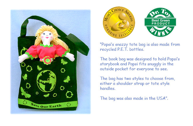 Popsi is the first recycled doll that comes with a new book for children called “Popsi The Daughter of Mother Nature”. The doll is a completely recycled doll that includes a tote bag for easy storage. Popsi isn’t just a regular girl; she is a recycled daughter of Mother Nature. Like the story of Pinocchio, Popsi will only remain a ‘real girl’ if she gives Mother Nature a helping hand. Popsi is 100% made from recycled P.E.T. Pet you said? No, not that kind of pet, I am talking about the acronym P.E.T. And, if you are really interested, it stands for Polyethylene terephthalate that was created in 1941 and now makes up the majority of our production of plastic bottles and synthetic fibers. Most P.E.T. bottles are coded with the recycle code of 1 as the international symbol of being a recyclable material and that is how Popsi the world’s first recycled doll is made.