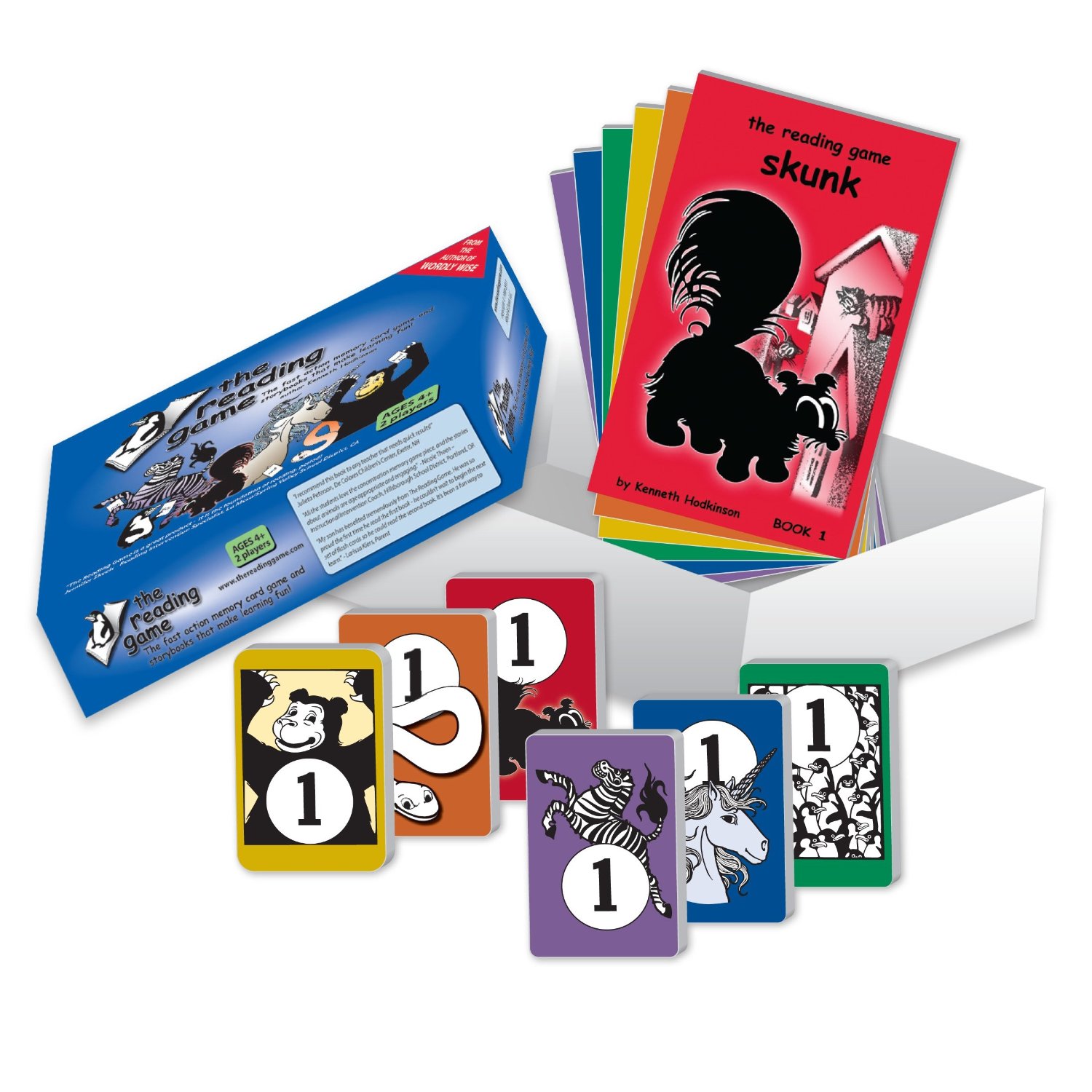 The Reading Game is an action-packed memory card game that includes six different stories that are told by using just thirty new words broken down into a set of five words per story. For example, after you finish the first game, the Skunk Story, the child will have learned five words (can, cat, is, me and not). Each story is illustrated with storybooks and cards that make the game exciting and enjoyable. The repetitive and fast paced nature of the game builds reading confidence with an element of a little competition (there is a winner every few minutes). Although all readers learn at their own pace, it certainly helps to learn faster when the learning process is fun! Highly recommended!
