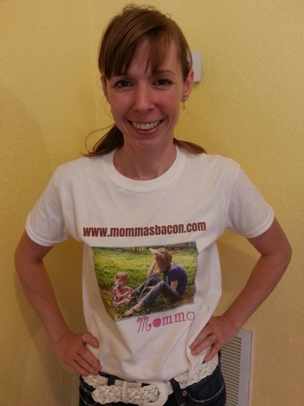 Check it out! Here is one of our fabulous winners (startraci) modeling her Momma’s Bacon Shirt!  Lovely!