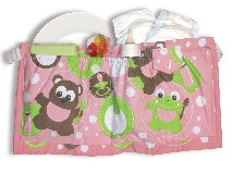 The Highchair Organizer is like a cabinet of baby feeding products that hooks nicely on your highchair.  Need some wipes?  No problem!  More bibs?  Of course?  A clean bowl and silverware?  All there right at the tip of your finger as soon as baby decides to get a little messy.  The straps are adjustable and fit on most highchairs.  This efficient product won’t clean the baby for you, but it will keep you prepared for your fun baby mealtime adventures! A pattern in green is also available for those who don’t want to sport the pink look.  This is also perfect to take to restaurants and to family’s and friend’s houses.  I think they will appreciate it as much as you will!