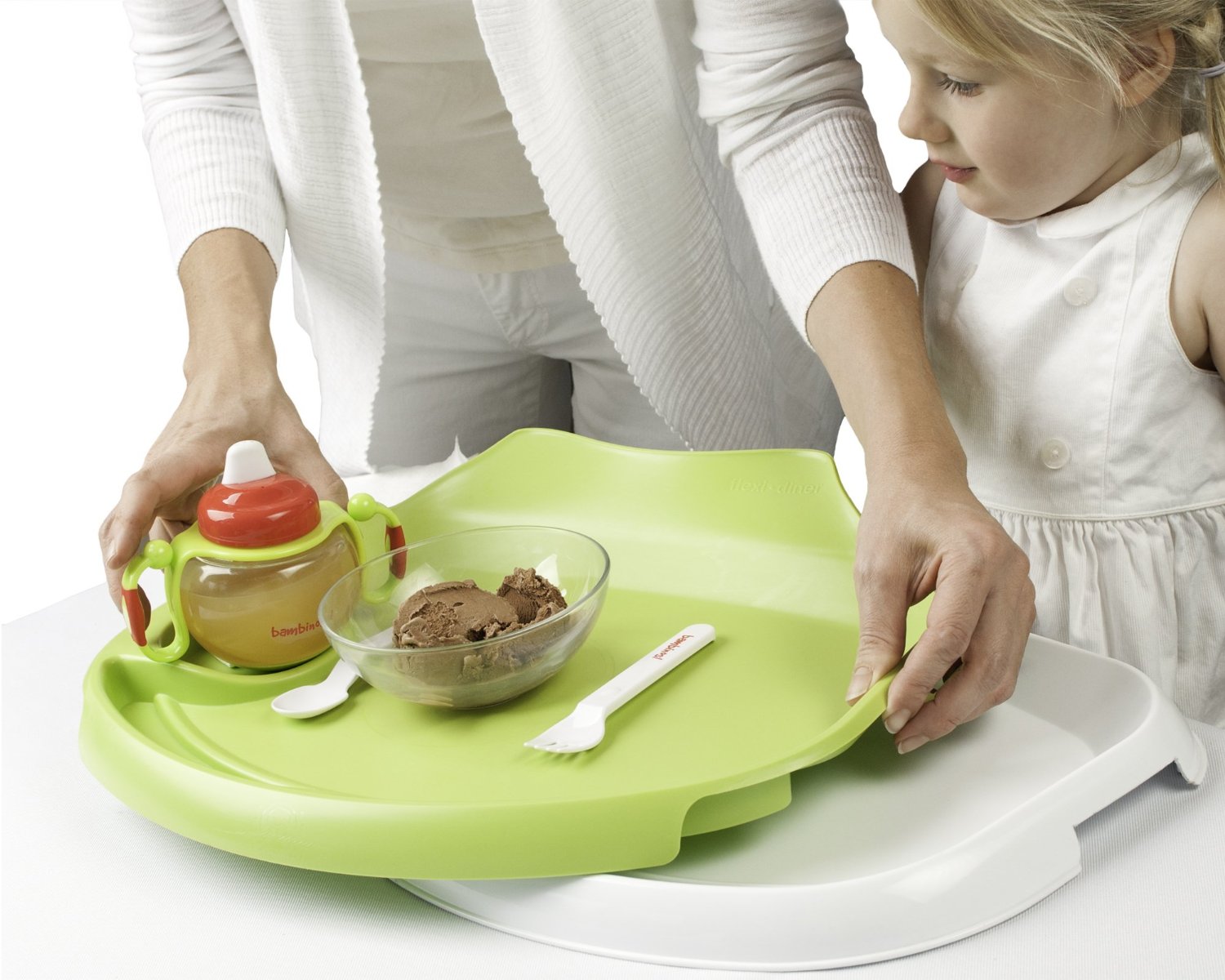 We were not prepared when our older daughter decided she was not interested in using a high chair anymore. Weren’t kids supposed to use their high chairs until age two or longer? It was clearly around the 18 month mark that she refused to sit in anything less than a booster and now that she is a preschooler she sits on a bar stool to reach our table. Considering her little sister is already showing this defiant (or we could say ‘spirited’) personality that makes her want to grow up faster, but thankfully there are many products on the market to make things like sitting at the big table safe for little ones. The Bambinos! Tidy Table Tray + Flexi-Diner is quite an awesome product for kids a little too young to be at the ‘big table’ without assistance but too old to be in a high chair. Yes!