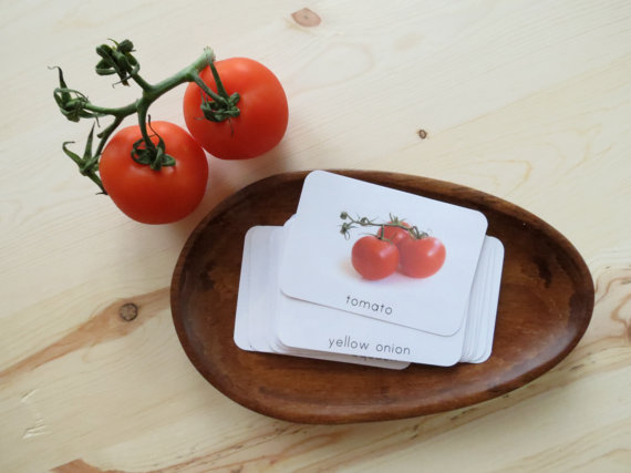 Most of our favorite (and affordable) Montessori activities come from Etsy shops. Free Spirit Kids is from mom and teacher, Allyson, who lives the Montessori life with her family and daughter in Woodstock, VA. We have used different methods of toddler cards (we have a really cute ‘foods of the world set’) and was excited to see these fun fruit and vegetable sets from Allyson. Basically, they are 3.5″ x 5″ laminated cards with pictures of different fruits and veggies with each word spelled out in large font for your child to absorb. These cards work best while cooking or using play-food for learning retention. Believe me, it works, and my daughter was saying dishes like egg drop soup from an early age from cards like this. The cards are stored in a muslin bag and have rounded corners for safe use for younger children. Don’t forget to check out the rest of Allyson’s Montessori materials shop on Etsy. You won’t be disappointed!