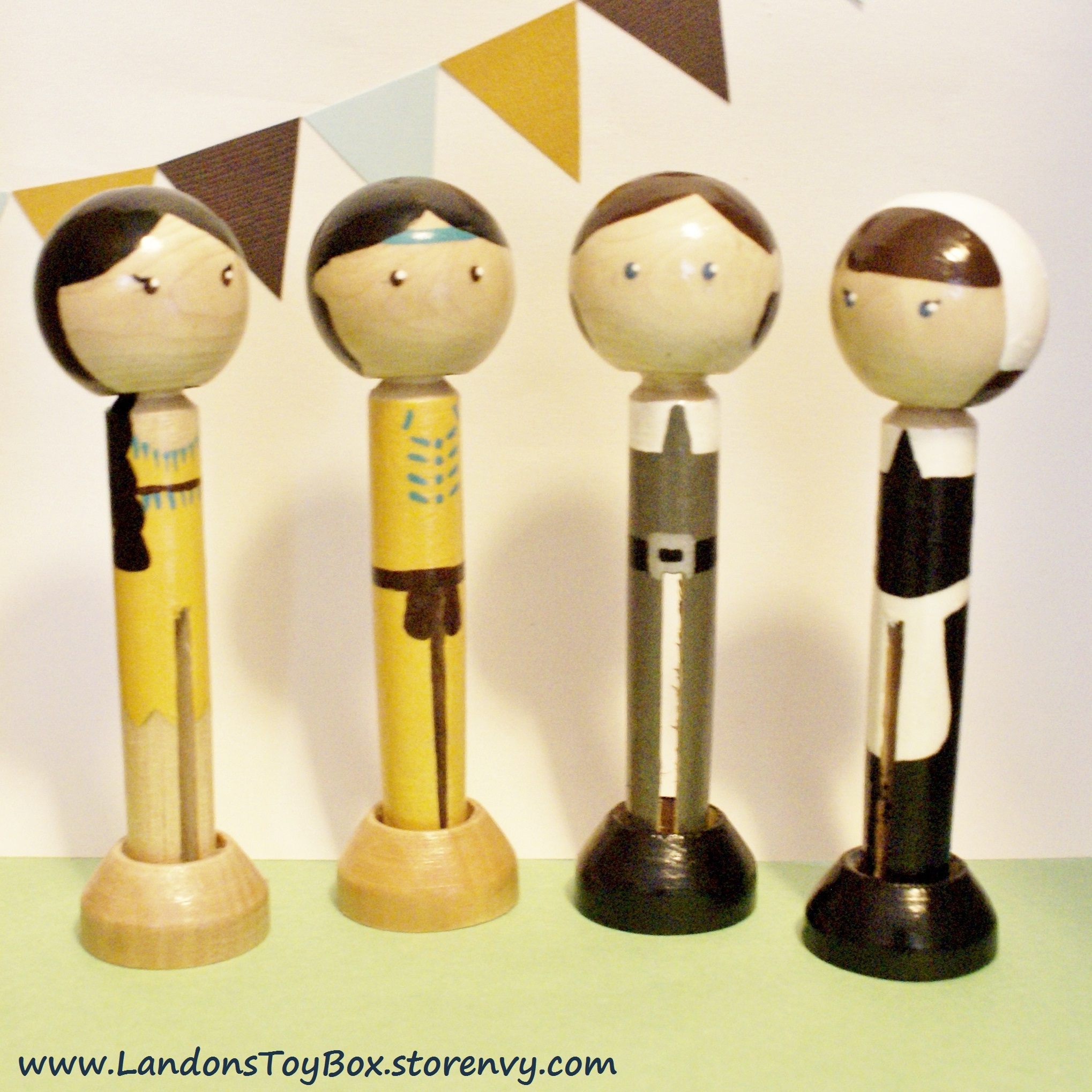 Fun, imaginative play that is also environmentally friendly? Sign me up! As soon as I saw these adorable Peg People made by the talented Holly Cothran of Rome, Georgia I was intrigued by her sets. I also have a thing for personalization and holiday specific doo-dads, so I was eyeing the Thanksgiving Play Set the most. It certainly did not disappoint and I love that I will now be able to get this out every year for the Thanksgiving season as yet another Momma’s Bacon family tradition. The really awesome thing about Holly is that she is all about custom and unique multiple options, so I was able to easily put together a Thanksgiving Peg People gift set with just one male Pilgrim and one male Native American for half the price of the usual four-peg Play Set for Thanksgiving. Awesome! All of the peg toys are 4.5″ tall and painted and sealed with non-toxic gloss finish. They are recommended for children ages three and older and not for children who like to ‘mouth’ items!
