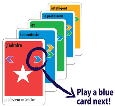The French game includes two decks of cards with 128 cards total that focuses on important language principles and color coded cards to help children make grammatically correct sentences. You begin to make sentences as you play and learn more foreign language words. Up to 16 different games can be played using the decks and you earn points by learning the French words and making up to thousands of sentences.