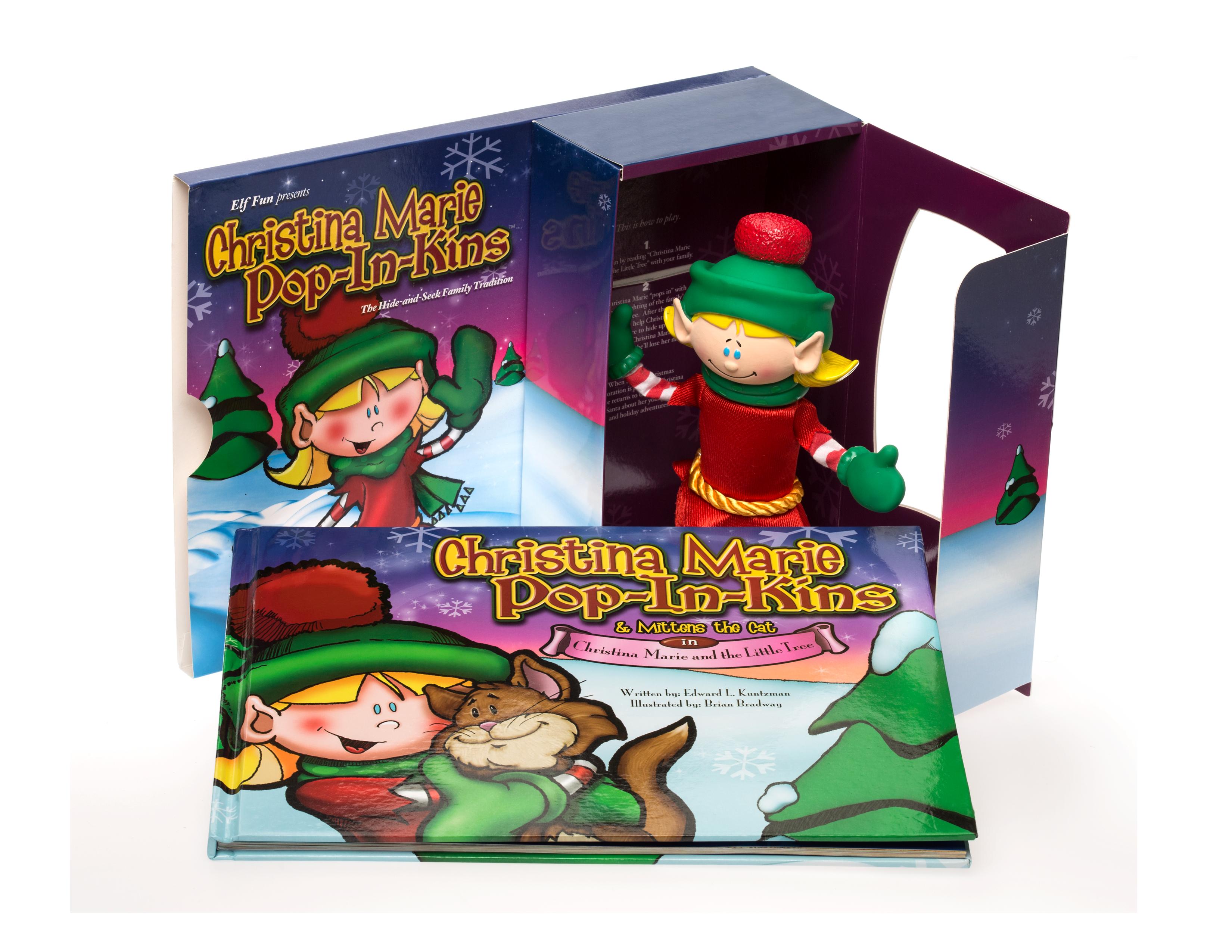 Last year I did a review on Christopher Pop-In-Kins, my family’s favorite Christmas elf. It is also an original elf doll concept that made his debut in the marketing world 28 years ago, but was a fixture in the Flora Johnson household since her children were young in the 1960s. As I had explained, this story may have stopped with Flora until one day her grandchild called her so excited to say that an elf had just ‘popped in’ for the holidays and Flora wanted to introduce her tradition to other families around the world. This Dr. Toy Classic Toy introduced a brand-new character in 2010, Christina Pop-In-Kins, Christopher’s sister! You can now purchase fun kits for the holidays for either elf and since we are the parents of little girls you can imagine having a girl elf in for the holidays is a huge success. Christina Marie also has a pet kitten named Mittens (fun Momma’s Bacon fact: our first family cat when I was born was named Mittens!), and as a family of cat-lovers, Mittens also became a loved character in the included book.