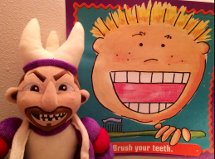 Prince Plaque hangs out in our bathroom. Great reminder to keep teeth clean for a preschooler, huh?