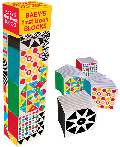 Baby’s First Book Blocks contain four little block-shaped mini books (2-3/8 x 2-3/8 inches) that are easily stack-able and will hold your babies attention visually: