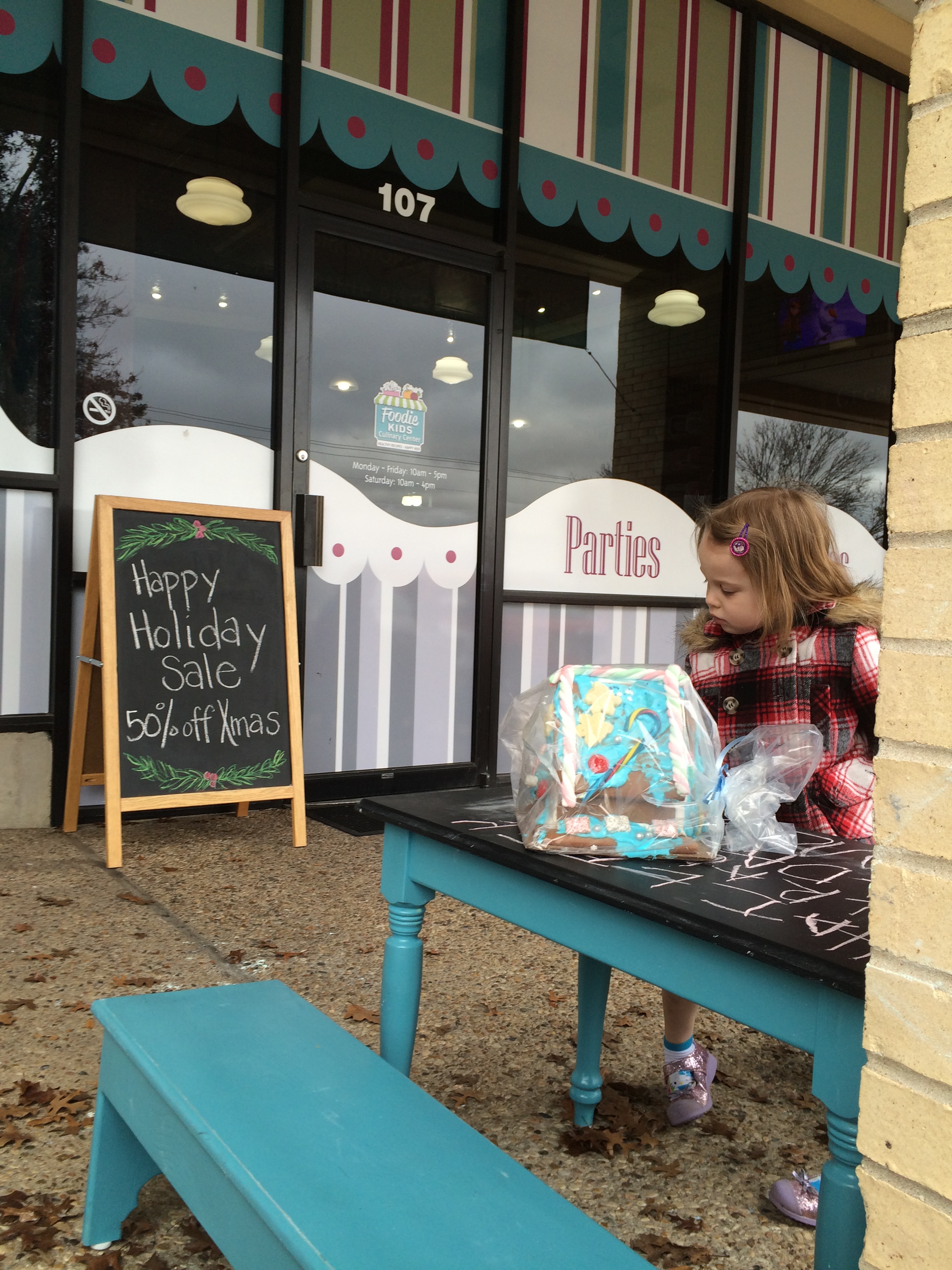 I LOVE making food with Brooke. It’s actually something we all (you know, the BACON family) enjoy, especially around the holidays. We usually find a local place to do gingerbread houses and have even successfully made them at home. But, I was quite shocked to see something called Foodie Kids. Do you Austinites know about this place? It’s an actual CULINARY CENTER FOR KIDS. Right here. In Austin. That focuses on making food for and with kids (you can do drop off depending on the classes) that focuses on healthy recipes. What? Yes, please.