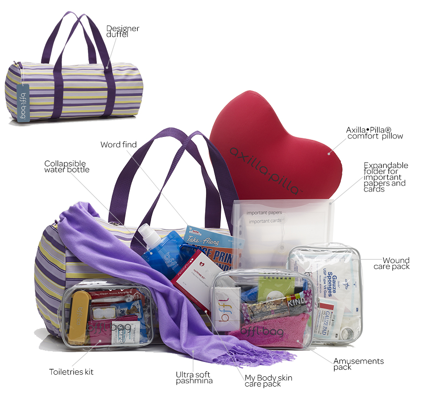 Join the growing list of hospitals which give BFFLBags® to patients at the time of their surgery or admission. Please email info@bfflco.com or call 914-713-8550 for more information on wholesale programs for BFFLBags®, Masthead® bras and other BFFL Co products.