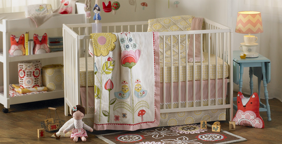 The Scarlet 4-piece crib set by Lolli Living has an overarching floral and nesting bird theme without being too matchy. Each item’s patterns are completely unique to anything else in the set yet it pulls the room together by somehow coordinating. The set comes with a quilt, two fitted sheets and a bed skirt and they are made with 100% cotton. The comforter is an appliqued quilt that the heirloom quality look and is probably my favorite thing in the set.
