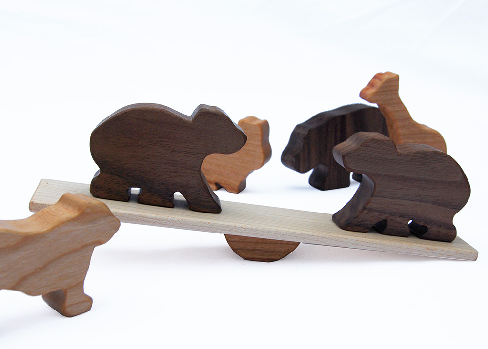 Manzanita Kids wooden Animal Seesaw is a wonderful toy for kids that is fun, engaging and educational. Little children, even my one year old, can begin to learn about balance and weight and the seesaw is a great way to demonstrate these new skills. The seesaw board is made from maple wood and handcrafted with a wood rocker (in either walnut, cherry or maple) to create two equilibrium positions.