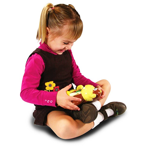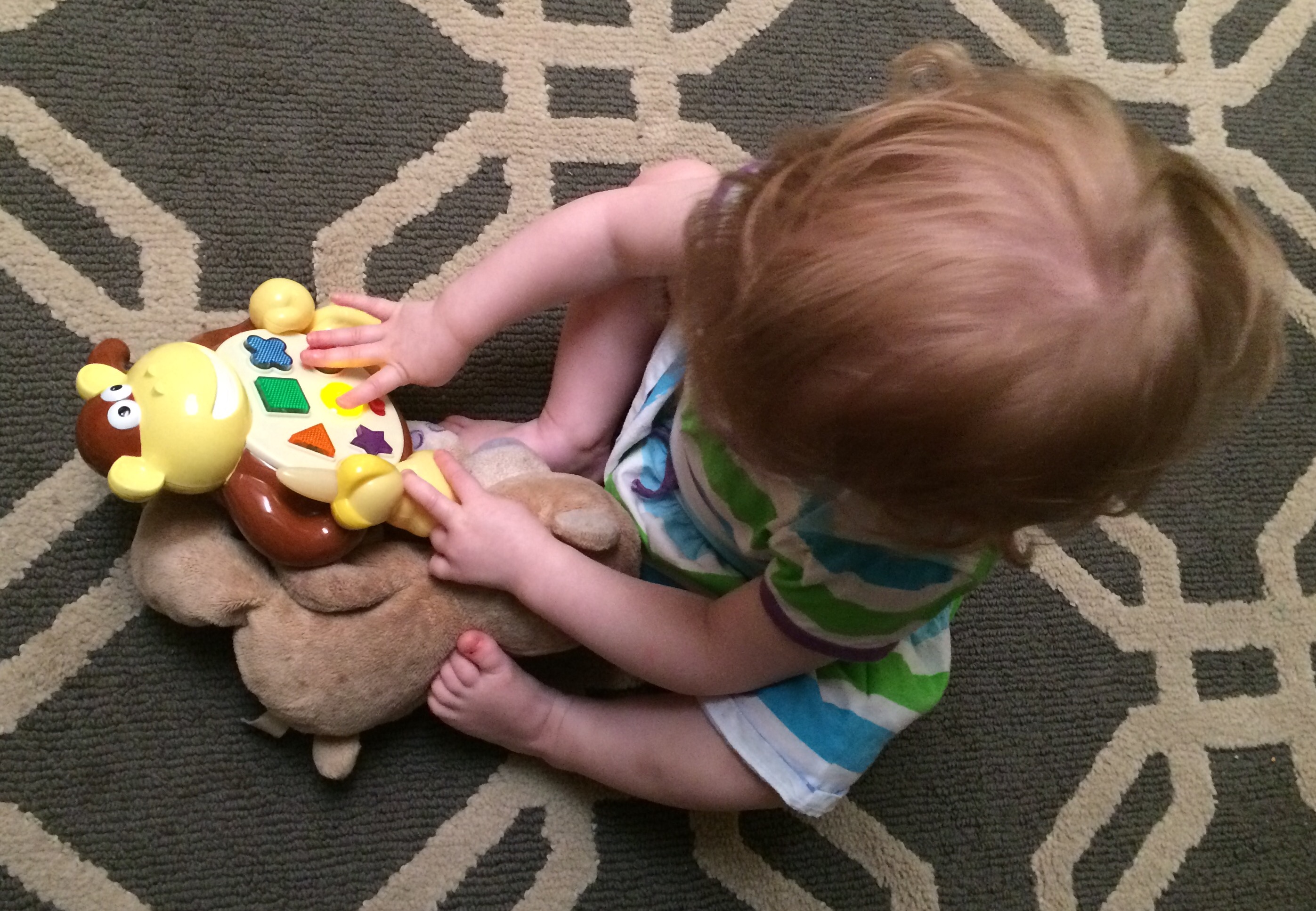 The Early Learning Colors and Shapes Monkey is a talking colorful toy narrated by an adorable monkey that Brie just loves. When you put Mr. Monkey in an on position in one of the two modes, he will talk to your child when they press each button. There is a mode for ‘shapes and colors’ and a mode for ‘play’, so when your child presses on a specific shape/color, they get to hear the name. Over. And Over. And Over. You will start to hear this little monkey’s voice in your sleep, but it is well worth the time and interaction your child has with learning from repeating the names. In the ‘play’ mode, the monkey will play different kid-friendly melodies and light up when each button is pressed. Brie loves that the buttons flash so she is enticed to keep playing. The Monkey requires two AA batteries and to cut down on energy drain, the Colors & Shapes Monkey also has a built-in auto shut-off. Awesome toy for children ages eighteen months and up.