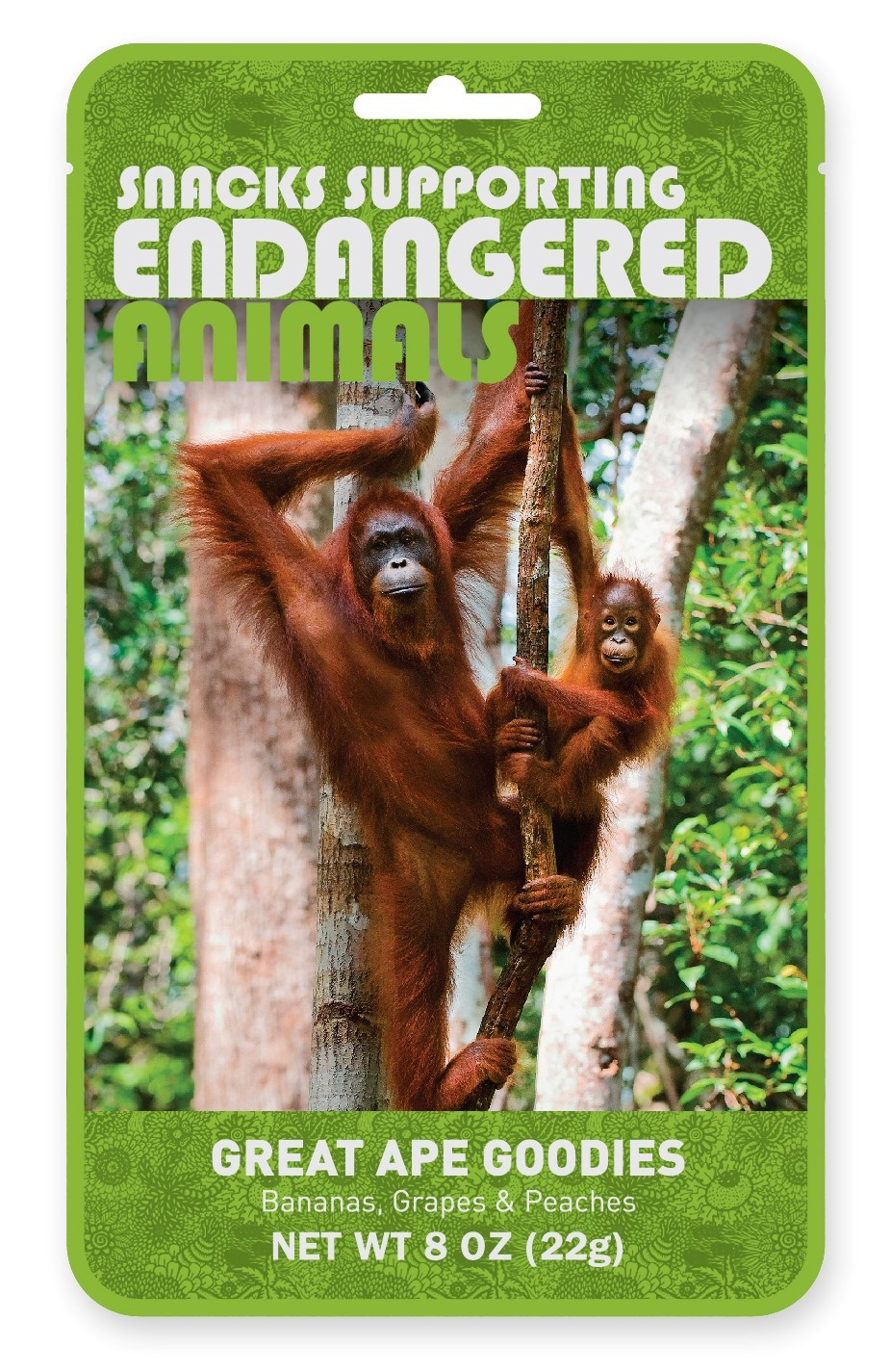 More About Orangutans: Orangutans are dependent on the rainforest canopy for both food and habitat. Due to illegal logging and deforestation, the rainforest is rapidly disappearing. Without intervention, orangutans could be extinct from the wild in less than two decades. With the purchase of this tasty snack, you are supporting organizations like Orangutan Foundation International and their efforts to protect these great apes and save their fragile rainforest habitats.