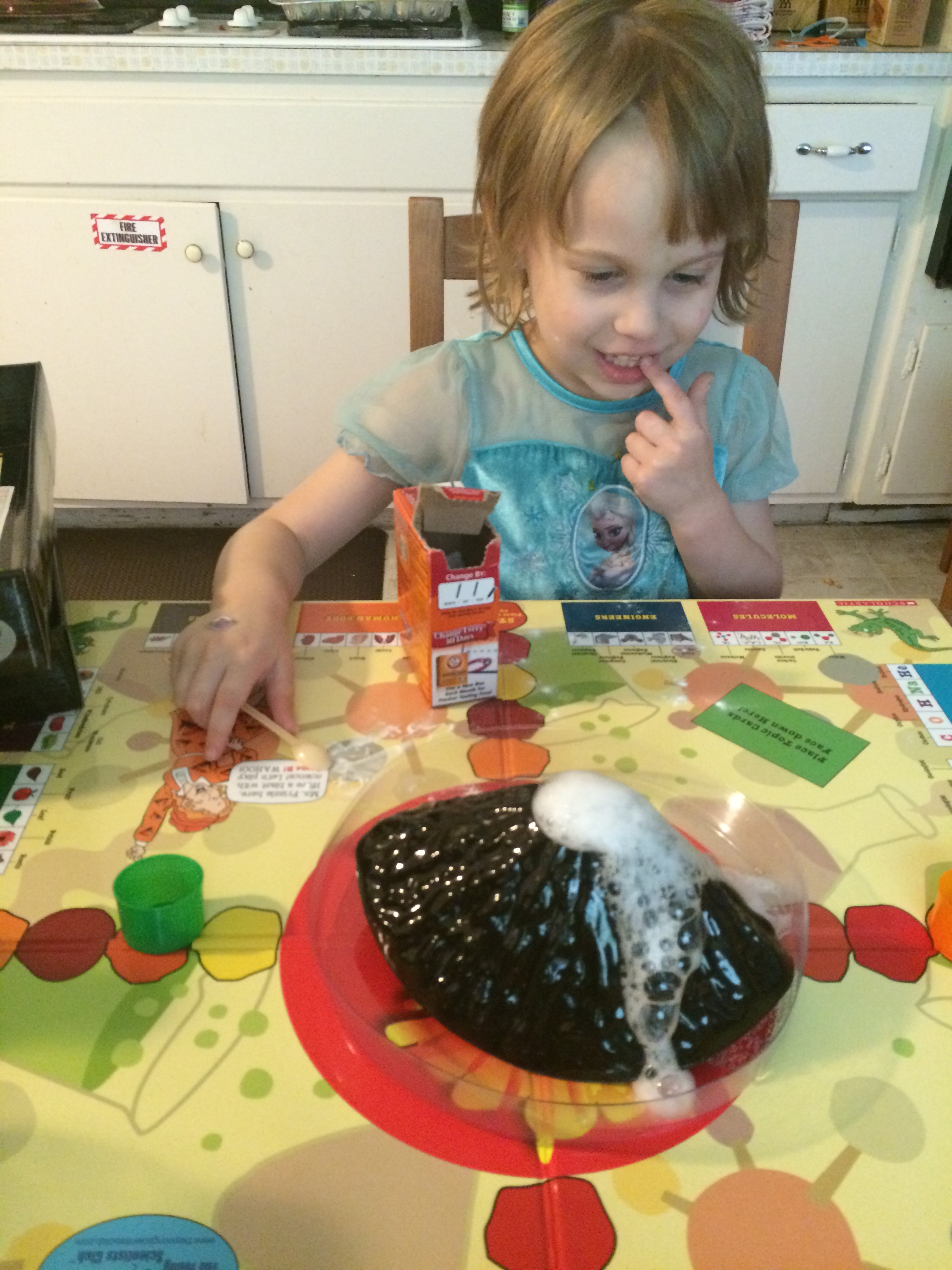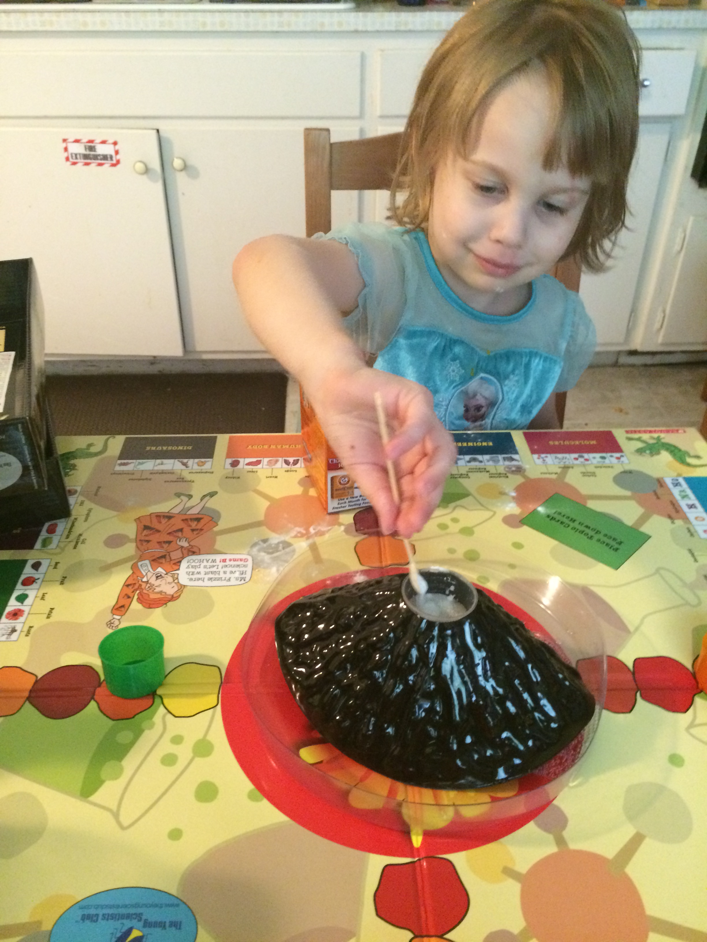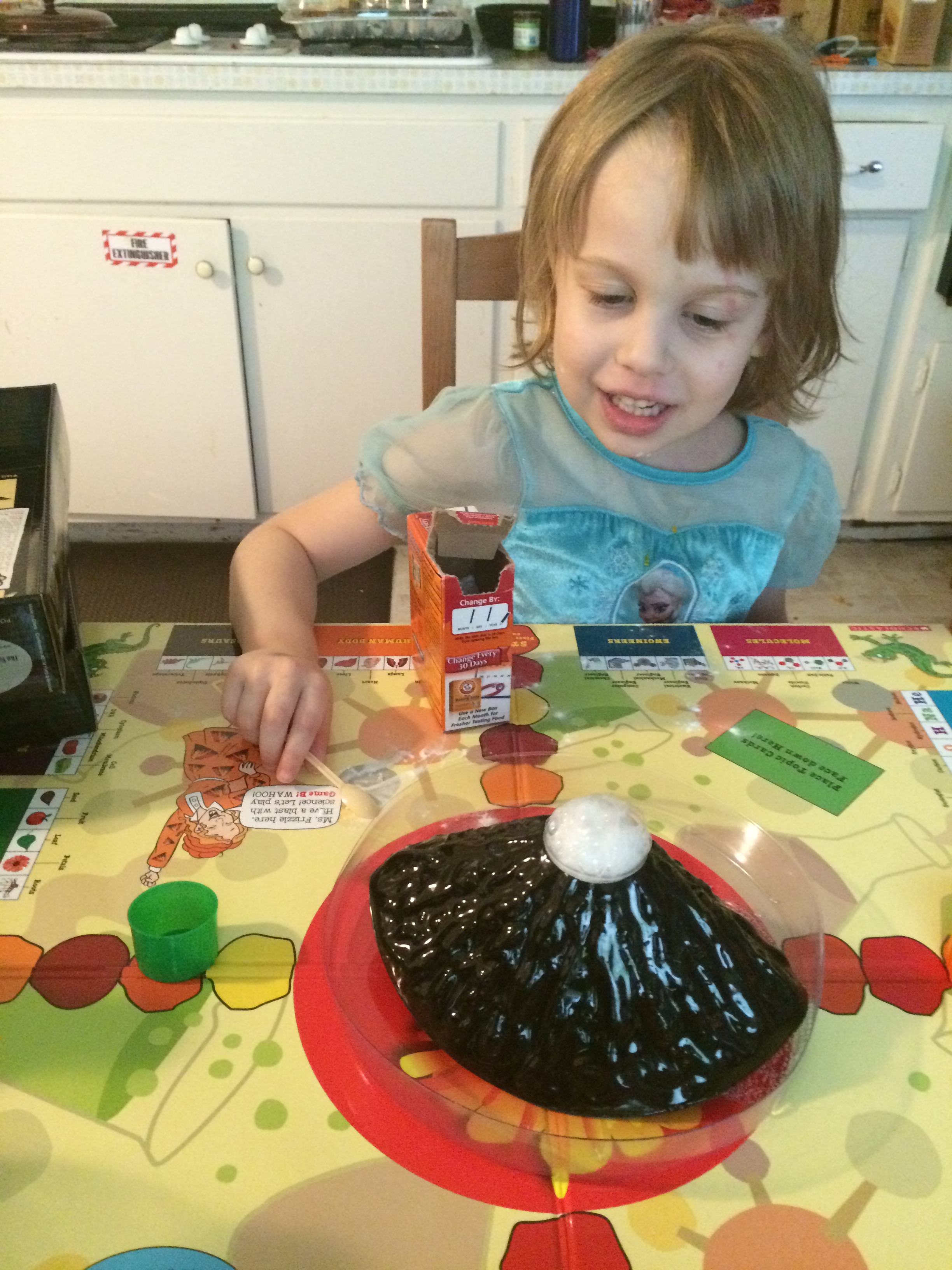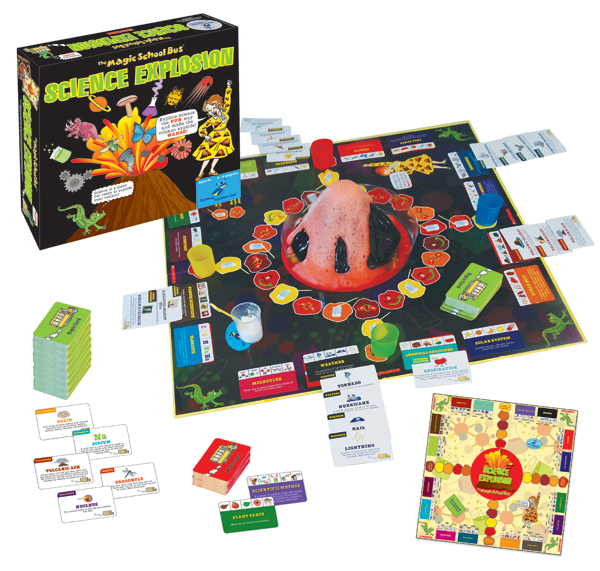 The Magic School Bus Science Explosion is a wonderful tool for grown-ups to encourage all children to pursue the sciences as they play at ages 5, 6 or 7. As the Young Scientist’s Club’s name suggests, it is never too young to get excited about experimenting with your hands. The Magic School Bus Science Explosion is all about learning the different fields of science and you want to be the first player to explode the volcano. Did I say explode?! YES! Science Explosion offers two exciting games in one where players can either match science-based topic cards to master cards or use memory and strategy skills in another game. The game has a large laminated two-sided board, volcano, bowl, 4 colored measuring cups, clear measuring cup, 16 science master cards, and 80 science topic cards for your own science adventure. The only thing you need to add to the game is the players and a little baking soda and vinegar for the explosion! Whimsical instructions can be read by youngsters or by an older sibling/babysitter/grandparent for a memorable adventure.