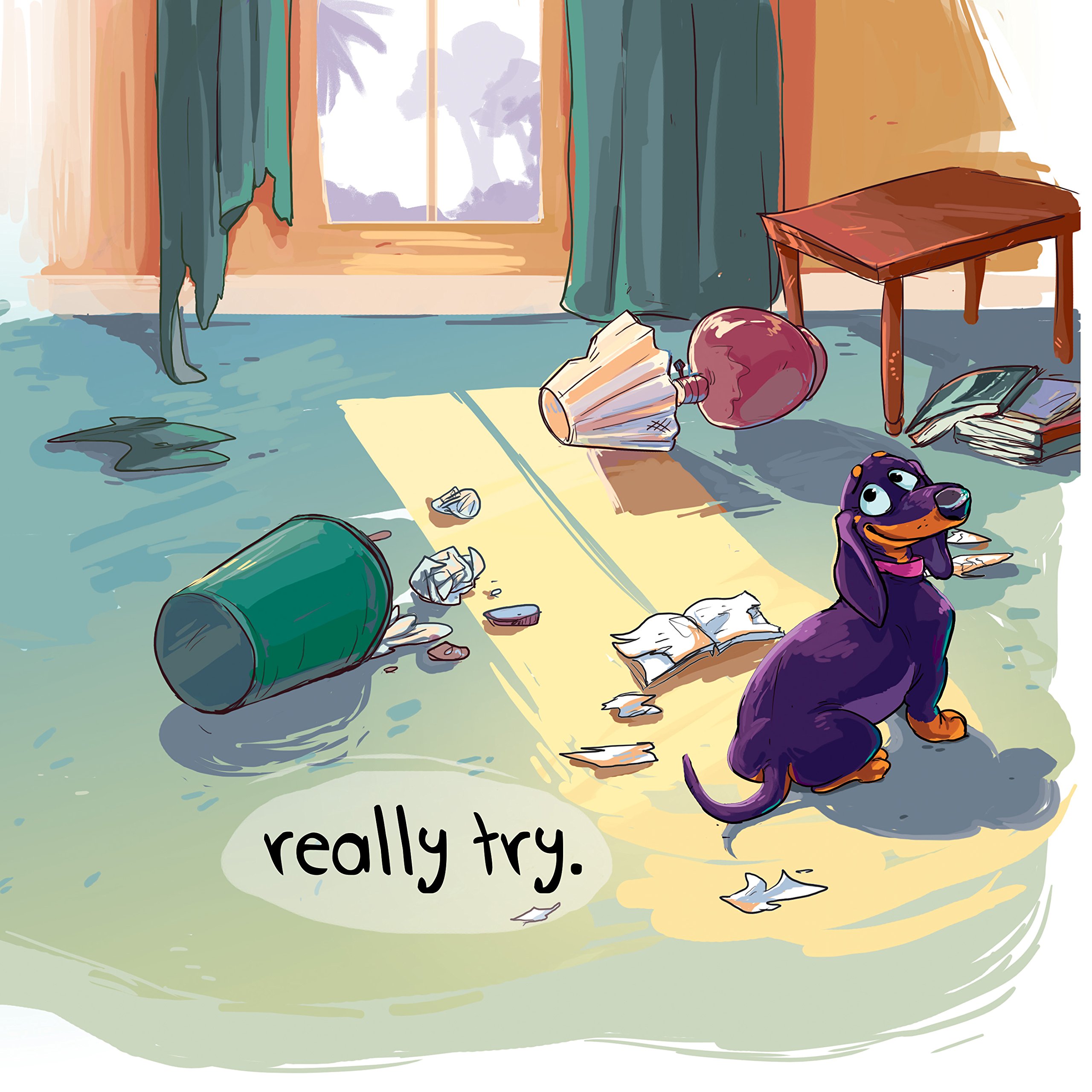 It’s Hard to be Good is the first of Hales’ Ellie the Wienerdog Life Little Lessons series and features rich, colorful and dynamic illustrations by artist Serene Wyatt. This book is better than a lecture about willpower to a young child, Ellie is introduced (after ‘innocently’ ransacking the living room) as having the urge to eat a delicious sandwich that has been made by her human friend and left momentarily alone with it in the kitchen. Ellie KNOWS she is not supposed to eat that sandwich, BUT it just SMELLS so good. What’s a dog to do? Will she resist her urge to do the right thing?