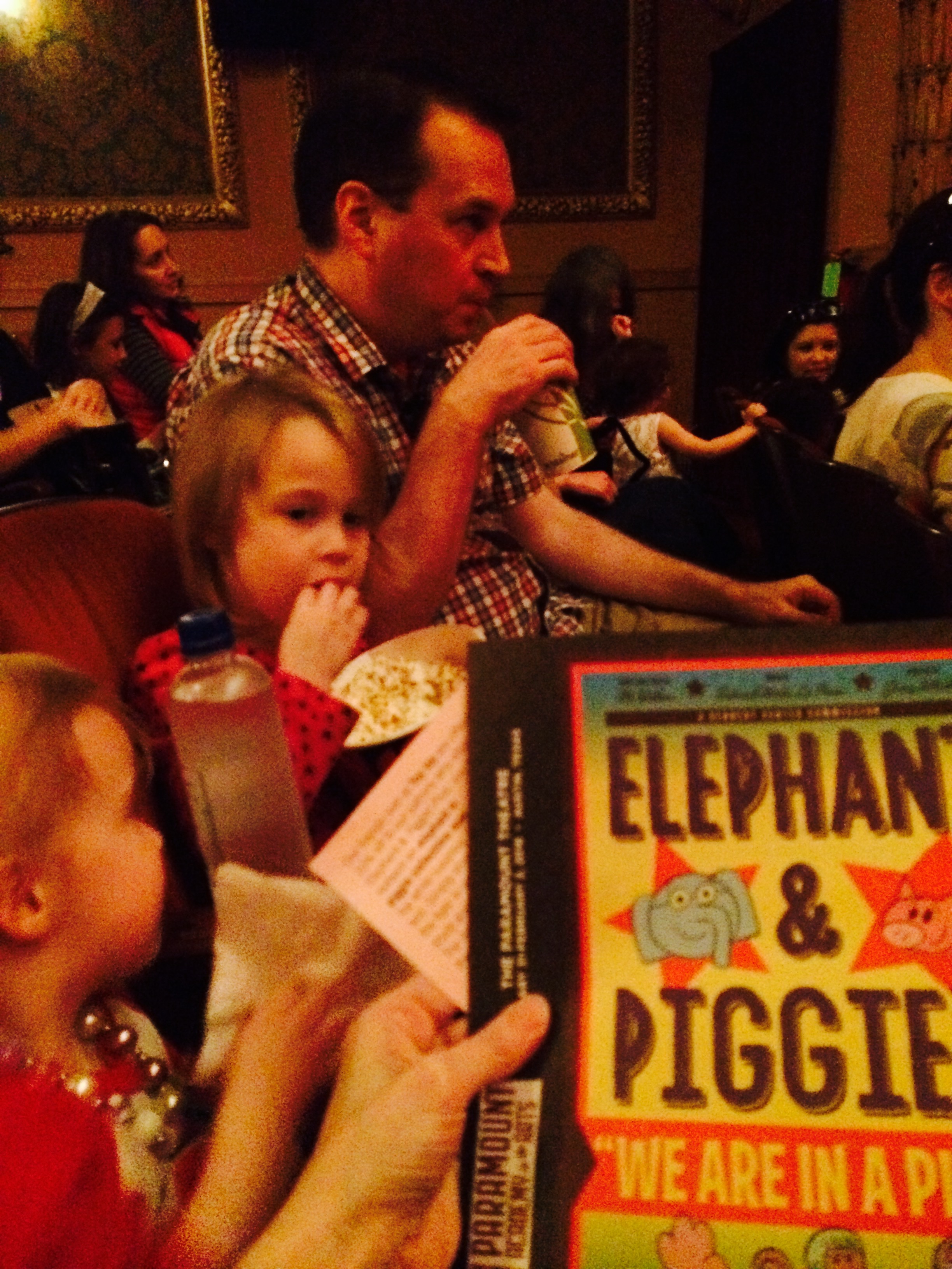 I wasn’t completely sure what to expect from this play, but it definitely exceeded anything I had tried to envision. First, the Paramount Theatre is really fantastic. Bob and I saw a comedy show here many years ago (pre-kids) and the theatre is celebrating it’s 100th year in existence. I grew up going to old Opera Houses and playhouses, so it’s just a really fancy and unique experience to go to a theatre with that much history. Amazing! Second, I had wondered how Mo Willlems’ books would translate to the stage and, since he DID write this play – including the songs- it went beautifully. The play was a mishmash of all of the books within this series and the ending was quite like you would expect if you have ever read the book Elephant & Piggie: We Are in a Book. The hour long play is timed perfectly for young kids and I even saw babies in the crowd! It was a great experience for all of us.
