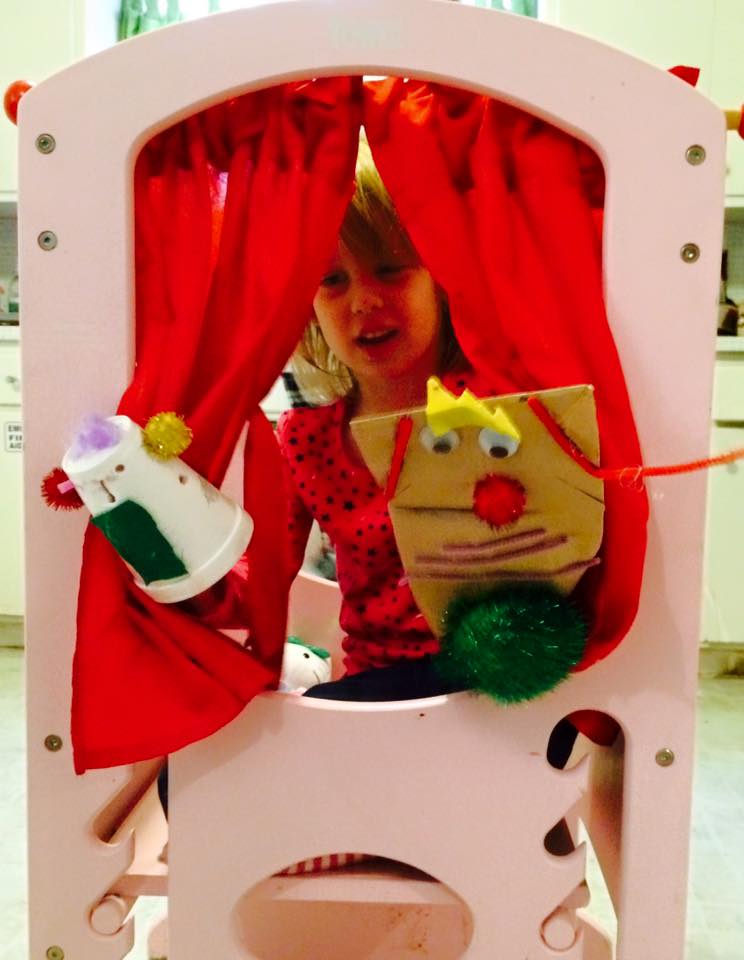 Brooke went to a Fantastic Magic Camp over the Christmas holiday break and she learned how to make puppets out of different materials. I think since she attended she has made no less than twenty different puppets out of things like toilet paper rolls and boxes from our recycle bin or items that could have gone to a landfill. Not only has she made these different puppets, she uses them to entertain us!