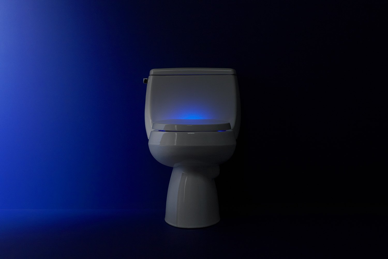 - The guiding light, located in the seat’s hinge, is visible with the lid down. It projects a gentle glow onto the toilet’s tank so users can easily see the toilet area when entering the bathroom.