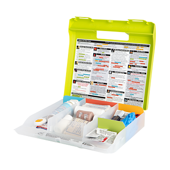 - Section 2: 1″ Tape, Sterile Roller Bandages, Gauze Pads, ABD Pad, Triangular Bandage, BurnFree® Burn Dressing, BleedCease® Blood Coagulent, Eye Pad, Elastic Bandage, Coverlet® Fingertip Bandage, Coverlet® Knuckle Bandage, Coverlet® Small Strip Bandage, Coverlet® Medium Strip Bandage, Coverlet® X-Large Bandage, Sterile Cotton-Tipped Applicators.