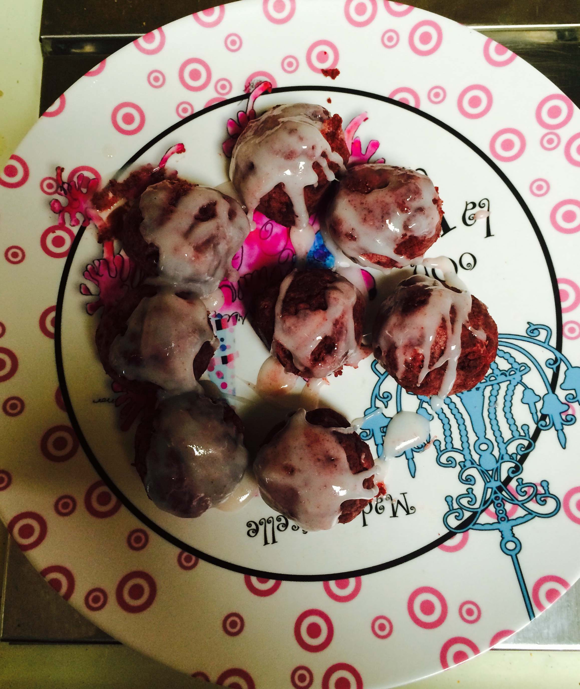 The kit came in a beautifully decorated box and had the ingredients of red velvet cake, white buttercream, and a white donut glaze. What we loved the most is that there was no baking involved! That’s right, the cake came in separate packages and all we had to do was open them! That was perfect. That didn’t mean we didn’t get dirty; Brooke had to work the cake with her hands and combine it with the white buttercream. After putting the red velvet concoction into little balls, we put them in the refrigerator to chill. During that time, we had to heat up the glaze to put on the finishing touches. It was a simple and fun way to get Brooke involved with making a dessert (with little kitchen damage in the process – Yay!) and what great results.