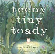 My driver’s license says I’m 5’4″, but I’m barely that tall – and it was an amazing growth spurt in high school where I finally reached above five foot in one year! As a summer baby, I was used to not only being the shortest in my class, but also the skinniest. I never really understood my nickname of ‘Bird Legs’ until one day while in middle school my friends and I were looking at our shadows on the gym door at recess and my legs did look like little sticks in comparison. It always made me very self-conscious as a child, I was the thin wispy girl who could blow away if the wind turned harsh, and I didn’t start to embrace my body until I was much older! It’s not unusual that both my young daughters have turned out teeny (Brooke, who has to get her pants hemmed she’s so skinny!) and tiny (Brie, who is short like me – they couldn’t even give me her height estimate at her two year appointment!), so I ‘toadally’ love the message that good things do come in small packages in a new Sterling book called Teeny Tiny Toady.