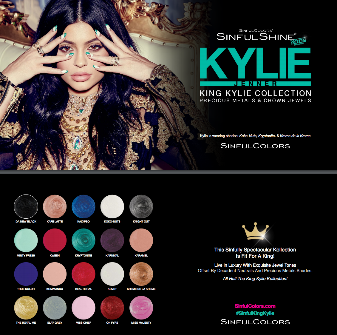 These highly curated, trend collections will be on shelves for a limited-time only, from March 1 – August 31st 2016. Individual collections will debut at select mass market retail partners nationwide, beginning with the King Kylie SinfulShine Collection, twenty luxurious shades of exquisite jewel tones offset by decadent neutrals and precious metals, as well as a top coat. This sinfully spectacular collection is fit for a king.