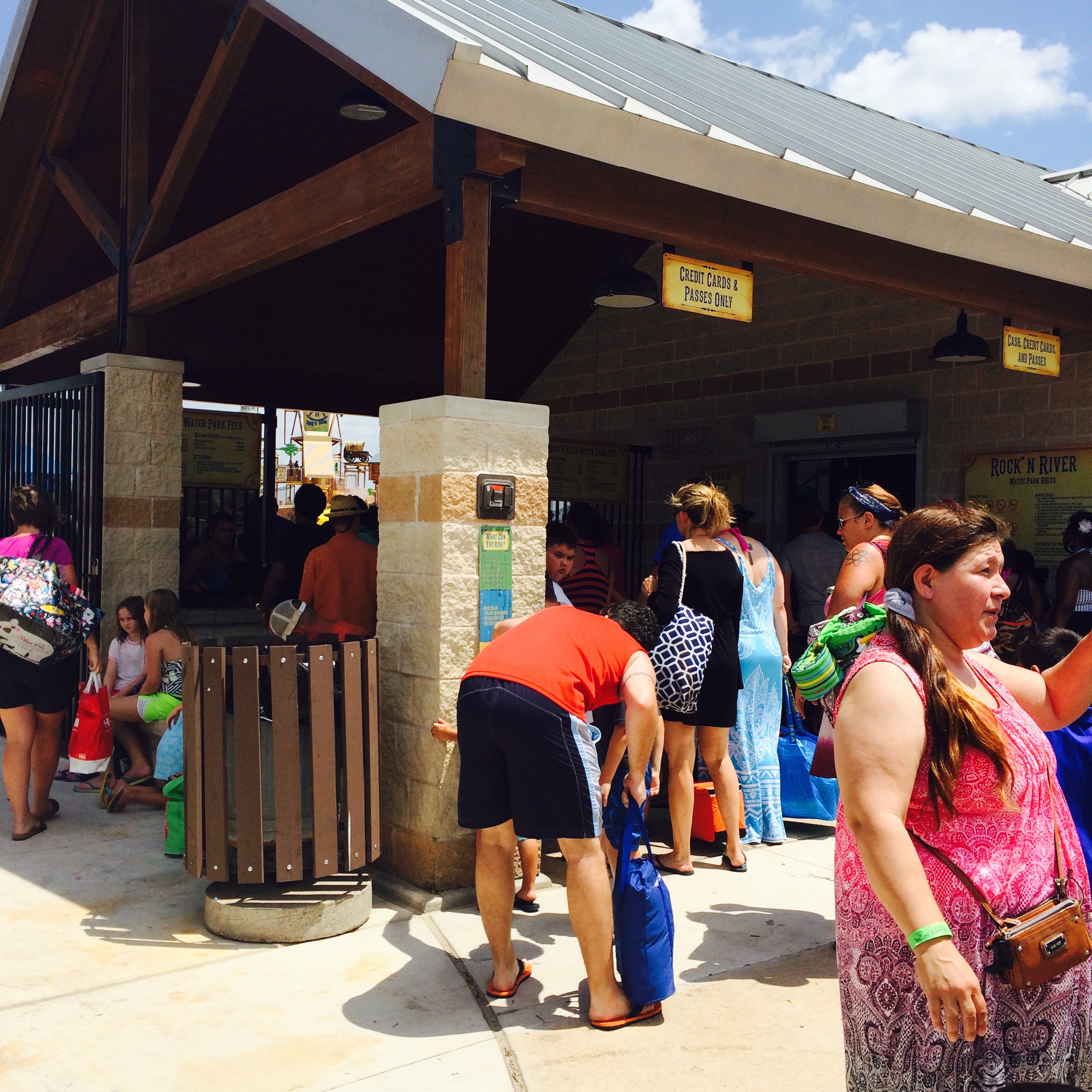 We arrived at the Rock’N River Park at exactly noon when it opened on a Saturday and there were already large lines to get in to the park. However, there are actually two lines; a cash, credit card, and pass line and one that is credit card only or pass line. The latter was much smaller, so we actually got into the park faster than I thought. Before you enter the park, there is a little height chart that you can have your child stand next to and will let you know the different pools where they can swim. There are certain pools where your child must be a strong swimmer in order to be in the pool.