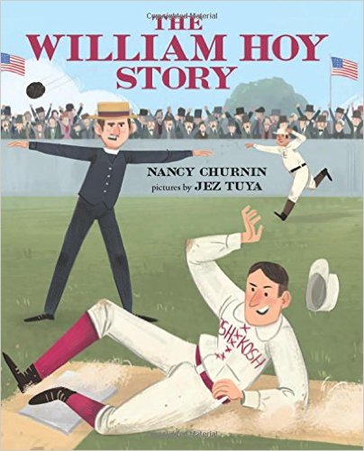 When my mom, the pseudo-genealogist, told me we were related to a man called “Dummy” Hoy from my father’s side of the family, who was a deaf baseball player, I was not surprised. My grandfather has worn hearing aids from the time that I remember and several of my dad’s cousins were deaf or had hearing loss issues. What I did not realize, until I read a new book through Albert Whitman called “The William Hoy Story: How a Deaf Baseball Player Changed the Game”, was that William (born in Houcktown, Ohio) was a great baseball player and is the reason that the umpires in baseball now use hand signals like strike, ball, and out. The fact that William, as a deaf man, even played on a professional team when he did is quite extraordinary. I had to look past the prejudice he faced, the terrible nickname of “Dummy” (which William embraced), and the real struggles that can still exist for those who are deaf to get to the heart of William’s story. You see, in Hoy’s time, the word “dumb” was used to describe someone who could not speak, and since the ability to speak was often unfairly connected to one’s intelligence, the words “dumb” and “dummy” became interchangeable with stupidity. Hoy, who was extremely intelligent, is noted for being the most accomplished deaf player in Major League history and was inducted into the Cincinnati Reds, his final team before retirement, Hall of Fame in 2003.