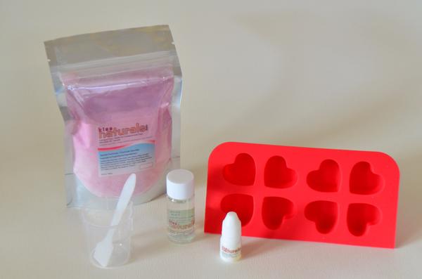 The Bath Fizzie Making Kit includes everything you need to make 8 all natural Bath Fizzies. The kit includes Kiss Naturals “Secret Formula” (ingredients listed below) to create fun bubbly fizzies for your bath. The fragrances included are derived from natural ingredients and Witch Hazel is also included. The silicone mold is shaped like little hearts to make bath time fun, tickly, fizzy and you can create the fizzies in colors of either blue or pink. Let the fun bubble to the surface with their natural Bath Fizzie kit. Mix their all natural “Secret Formula” with our naturally derived fragrances and soothing Witch Hazel to make fun shaped bath fizzies for tickly, effervescent fun in the bath.