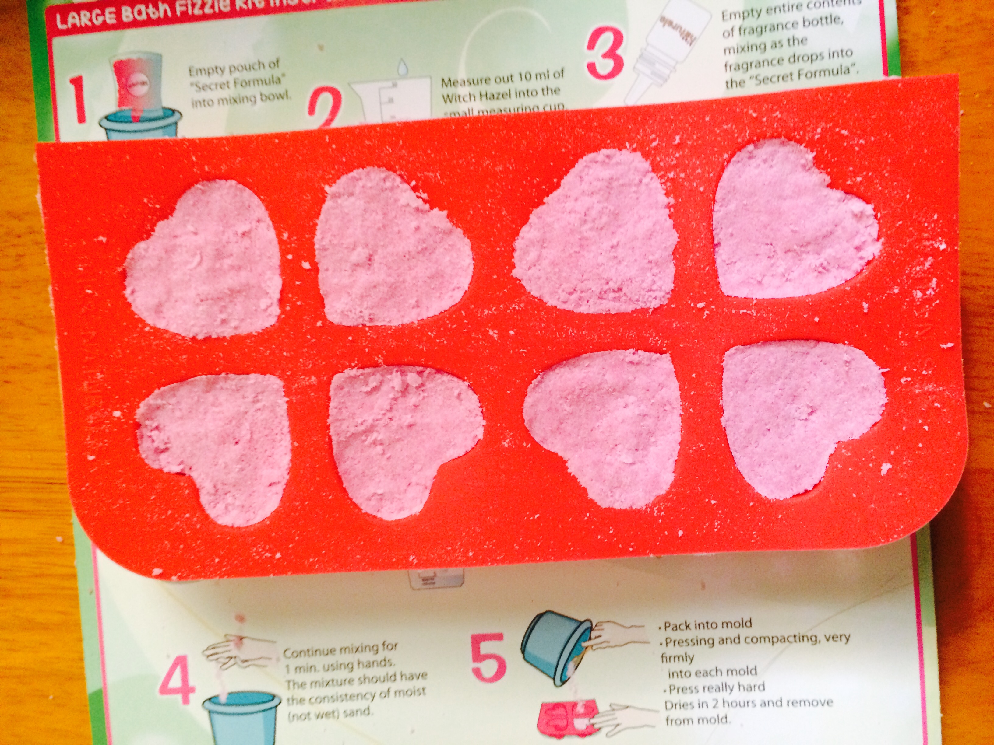 We had so much fun making these very simple Fizzie Bath bombs and the only extra item you need that is not included in the kit is a bowl for mixing. Please note that this kit can actually make two sets of bath bombs; one that is blue in color and the other that is pink. The package contains two different little tubes of fragrances to make each one, too. To start off, you just need to measure out the perfect amount of witch hazel into the measuring cup provided. Next, you pour in one of the two packages of their “Secret Formula” with either the pink or blue shade. After that, you mix in your pre-measured witch hazel as well as an entire bottle of one of the two fragrances. Here’s where the work begins. You will need to hand mix all the ingredients until it is the texture of ‘wet sand’. Basically, you want the mixture to form a ball into your hand but you don’t want it to be too wet. After that, you pour the ingredients into the heart-shaped molds where it will need to dry for at least two hours until it is ready to use in your bath. Sound easy? IT IS! It’s so easy that Bob and I started to discuss how we could start making our very own from scratch! However, it was so nice and easy to make with Brooke and she was so excited to use her own bath fizzies in her nightly baths. Well done, Kiss Naturals! We will definitely use more of their products in the future. Brooke is really interested in making her own hair chalk next!