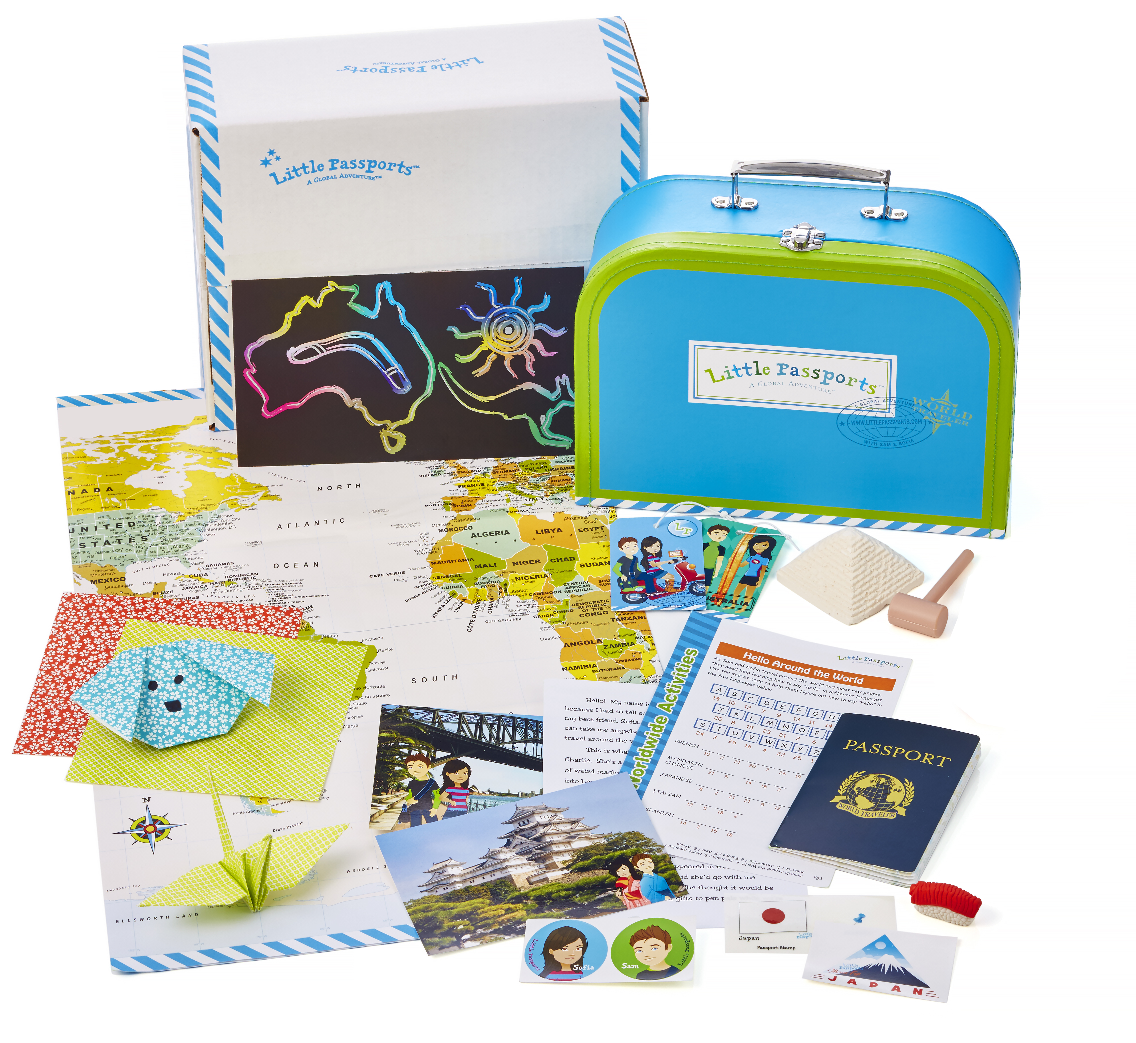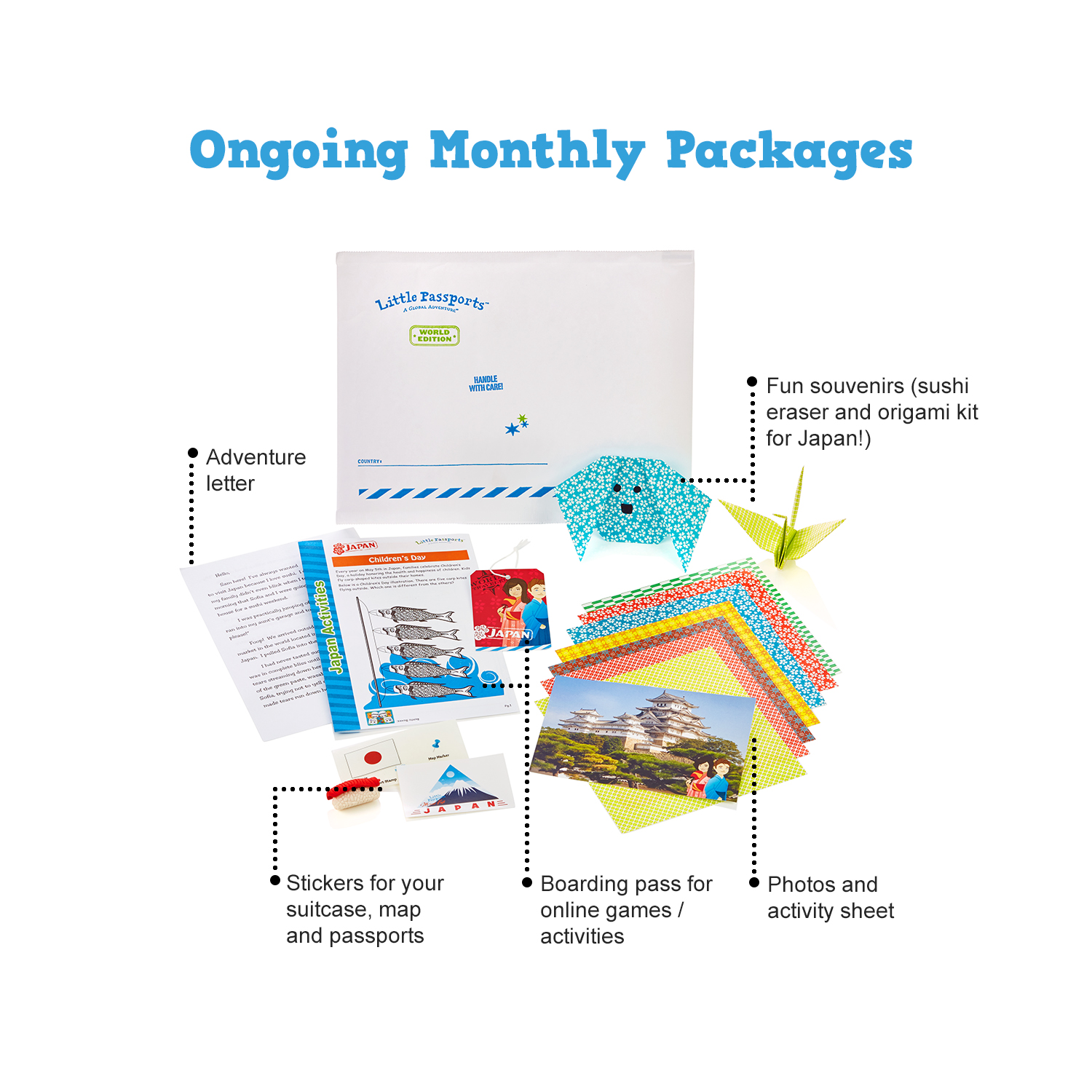 The first kit arrives with a world passport for every child in the classroom and includes materials that reinforce geography, reading, and problem-solving skills. The teacher also receives a digital Teachers Guide to help him or her integrate each month’s lesson into their curriculum. The material includes bonus content, vocabulary, printables, and even a pop quiz to test the students on what they have learned. Each month, every student in the class can add a new country’s sticker into their very own World Passport and create fun souvenirs like making origami from the Japan package.