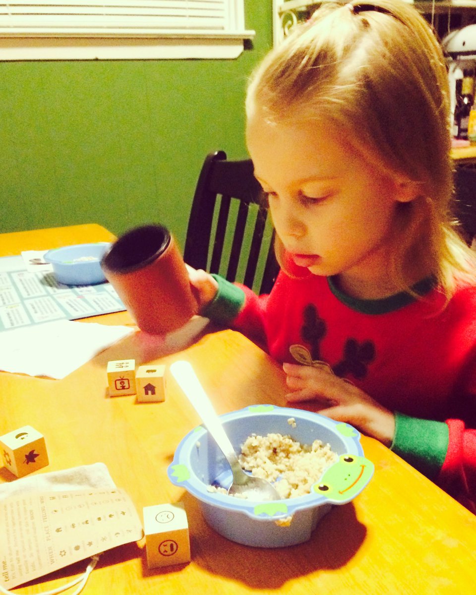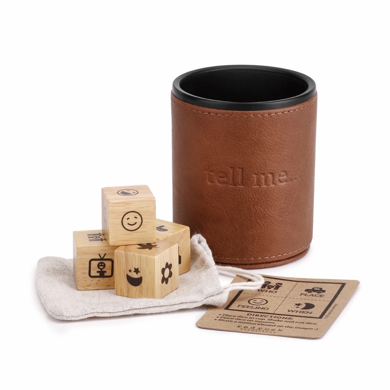 My family and I LOVE these ‘Tell Me’ Conversation Blocks at the dinner table. We let each person take a turn rolling the blocks which have various pictures for prompts to help guide each person to either tell a story, talk about a memory, or talk about their wish for the future. Block descriptions are “Who”, “Place”, “Feeling”, and “When” and it comes with a little direction card that conveniently fits into the holder to explain the different pictures on the blocks. Our oldest daughter, Brooke, loves these blocks and she’s gotten very good at telling wild tales depending on what she rolls. It’s fun to hear her use her imagination and she always incorporates part of her day or people and things in her life into her stories. We have even started to use the conversation blocks at breakfast on Saturday mornings and it’s something I look forward to doing with the girls. Tell Me Conversation Blocks makes dinnertime a more meaningful experience because we are listening and talking with each other in an organized yet very creative way that brings up lots of fun conversations.