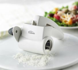 With Trudeau’s Rotary Grater you can grate your ingredients safely and effectively with Trudeau’s multiple use Rotary Grater. The product is a dishwasher-safe grater and constructed of a stainless steel drum grater in an impact resistant white plastic frame. The handle holds food in place while the soft touch, non-slip revolving knob arm controls grating. This makes it easy to use as well as being quick to disassembles for cleaning. Let guests pass the grater around the table with no worries of touching the block of cheese (or making a mess) as they serve themselves. Rotary graters are also faster and more user-friendly than other kinds of graters, the cylindrical grater plate never gets close to fingers.