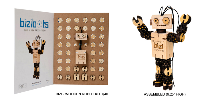 Not a problem! BiziBots are innovative wooden robot kits, made from locally sourced, non-toxic materials. Each bot is crafted from solid maple and birch plywood and has 50 articulated parts connected by elastic cords. You can assemble and configure your bots in million ways and the bots come with assembly instructions. Details include laser etched graphics and a unique RIN (Robot Identification Number) which I explained in the above paragraph. Once your Bot is assembled, they are fun to position in multiple ways. They delight the eye and engage the mind. The kits are geared towards ages 7y – 12y, but you can certainly help a younger child with the build, too.