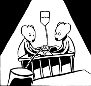 Spot 12 is Jenny Jaeckel’s graphic memoir about her experience with her newborn daughter who had to be in the Neonatal Intensive Care Unit (NICU) for almost 6 months. Graphic black and white images of anthropomorphized animal characters that are sometimes cute and sometimes chilling, convey the raw, mixed emotional edge of Jenny’s experience and that of her family.