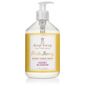 We are a honey family if there ever was such a thing. We use honey instead of jelly, honey instead of sugar and honey for marinades, on waffles and in tea. We use a lot of honey, or as my oldest daughter used to call it (laughingly), ‘bee barf’. I’ve become somewhat of a self-proclaimed honey connoisseur over the years and each variety has tasting notes, facts and plenty of fantasy. It was no wonder I am sweet on Deep Steep’s Fresh Honey Collection of 100% natural raw honey bath, body, and hair care products. How delicious it is!