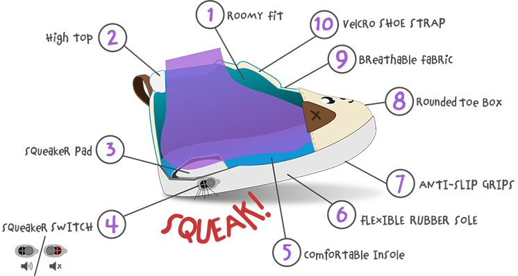 There are other squeaky shoes out there, but you can’t turn off the squeaker without taking the whole thing out. Not only does that make it easy to lose the squeaker, but it could also turn it into a choking hazard. That’s why Ikiki created their patented adjustable squeaker that can be turned on or off with the flip of a switch.