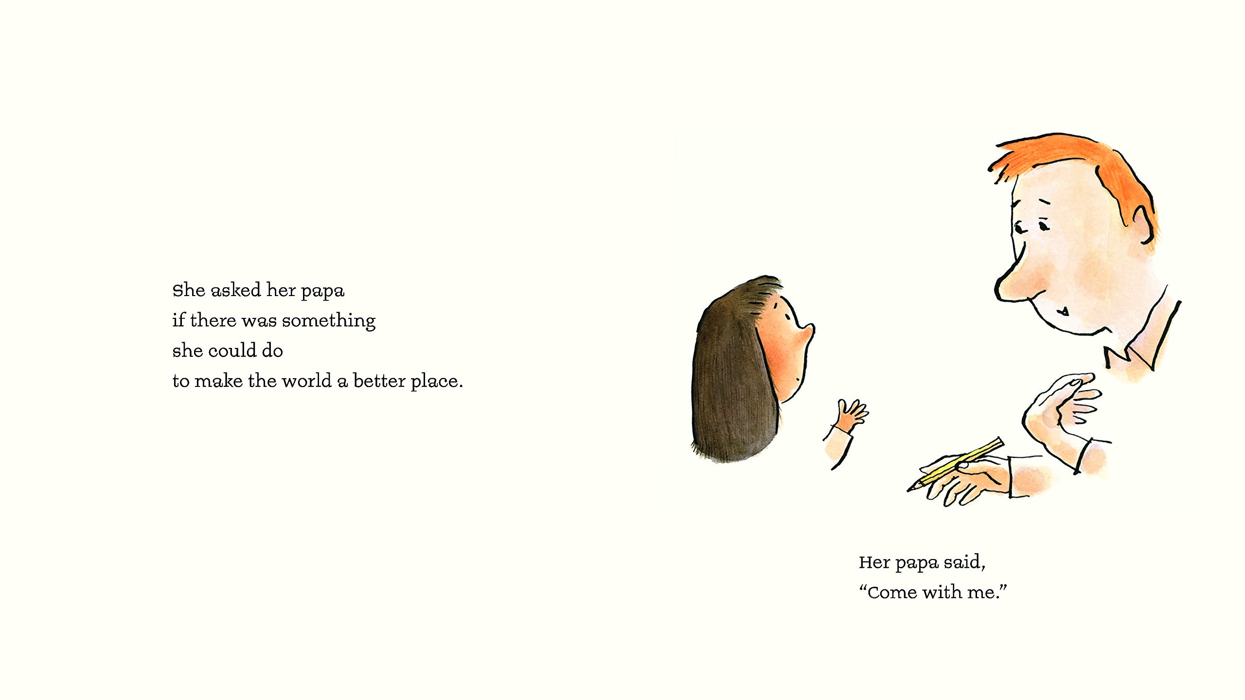 When the news reports are flooded with tales of hatred and fear, a girl asks her papa what she can do to make the world a better place. “Come with me,” he says. Hand-in-hand, they walk to the subway, tipping their hats to those they meet. The next day, the girl asks her mama what she can do—her mama says, “Come with me,” and together they set out for the grocery, because one person doesn’t represent an entire race or the people of a land. After dinner that night, the little girl asks if she can do something of her own—walk the dog . . . and her parents let her go. “Come with me,” the girl tells the boy across the hall. Walking together, one step at a time, the girl and the boy begin to see that as small and insignificant as their part may seem, it matters to the world.
