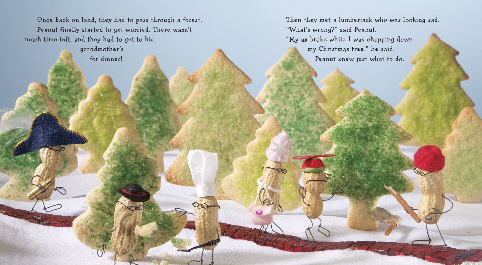 Peanut is going over the river and through the woods to his grandmother’s house for Christmas, but getting there is a food-filled adventure for this little nut! First he gets stuck in a traffic jam (make that a traffic jelly), then the bridge is closed so he has to take a (gravy) boat across the river, where he gets lost in a forest of (cookies shaped like) Christmas trees! But while the delays dismay his friends and family, Peanut embraces his role as the Merry Christmas Nut to cheer them up.