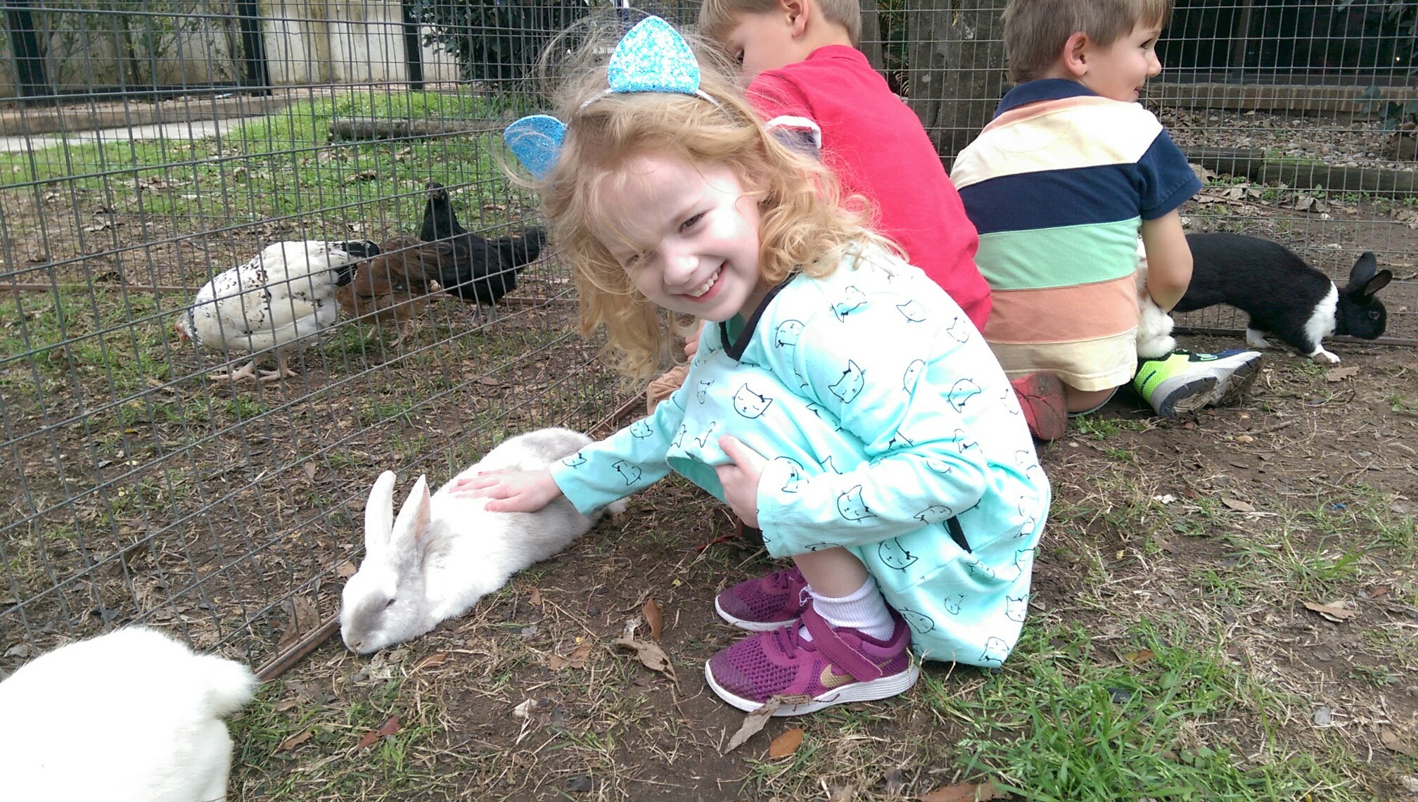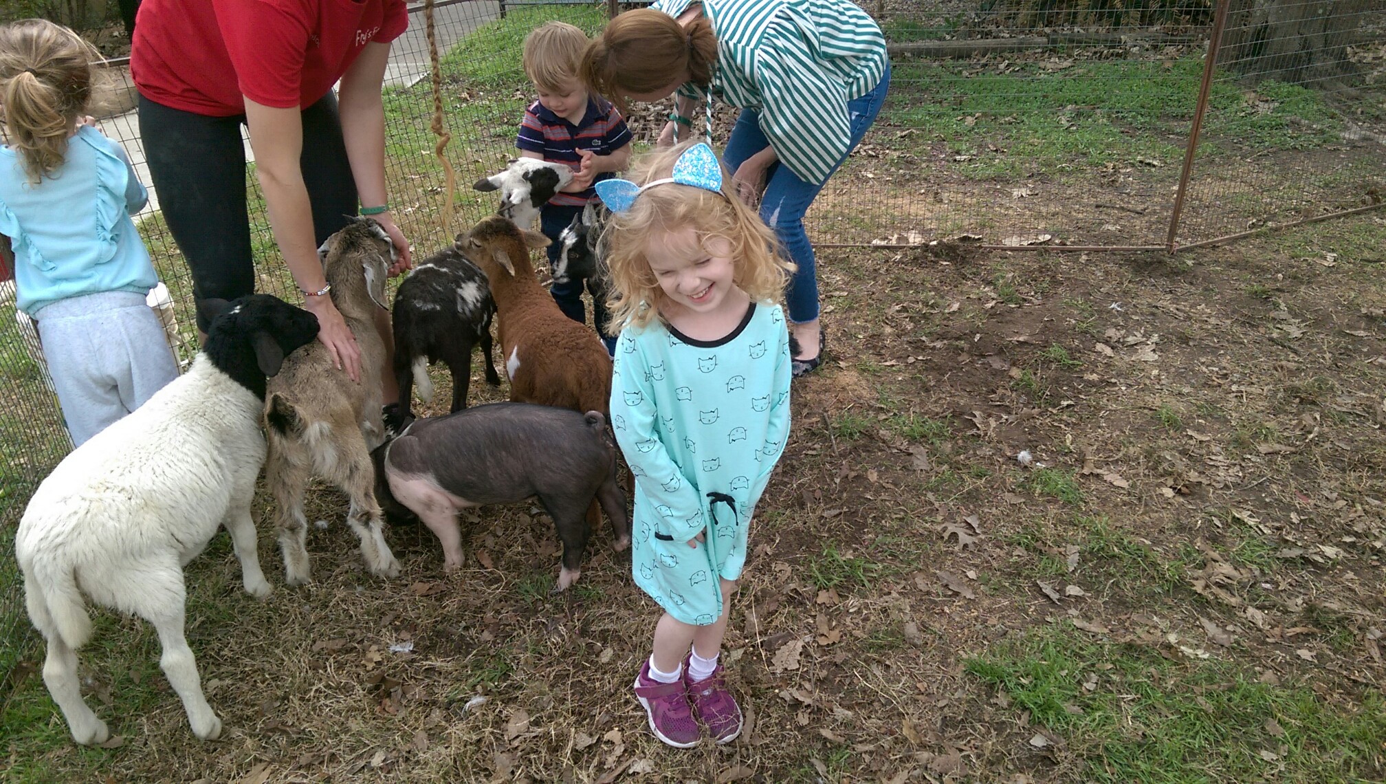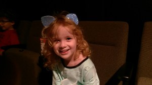 Our family loves going to the ZACH and it was a huge surprise that there was a petting zoo outside the theater today! The kiddos were so excited! Brie was already decked out in her kitty clothes for the animal-inspired ‘Goodnight Moon’ book for the occasion, so she made a beeline to meet the various critters before the show. It was a nice and unexpected touch for the little ones who were waiting to see the musical.