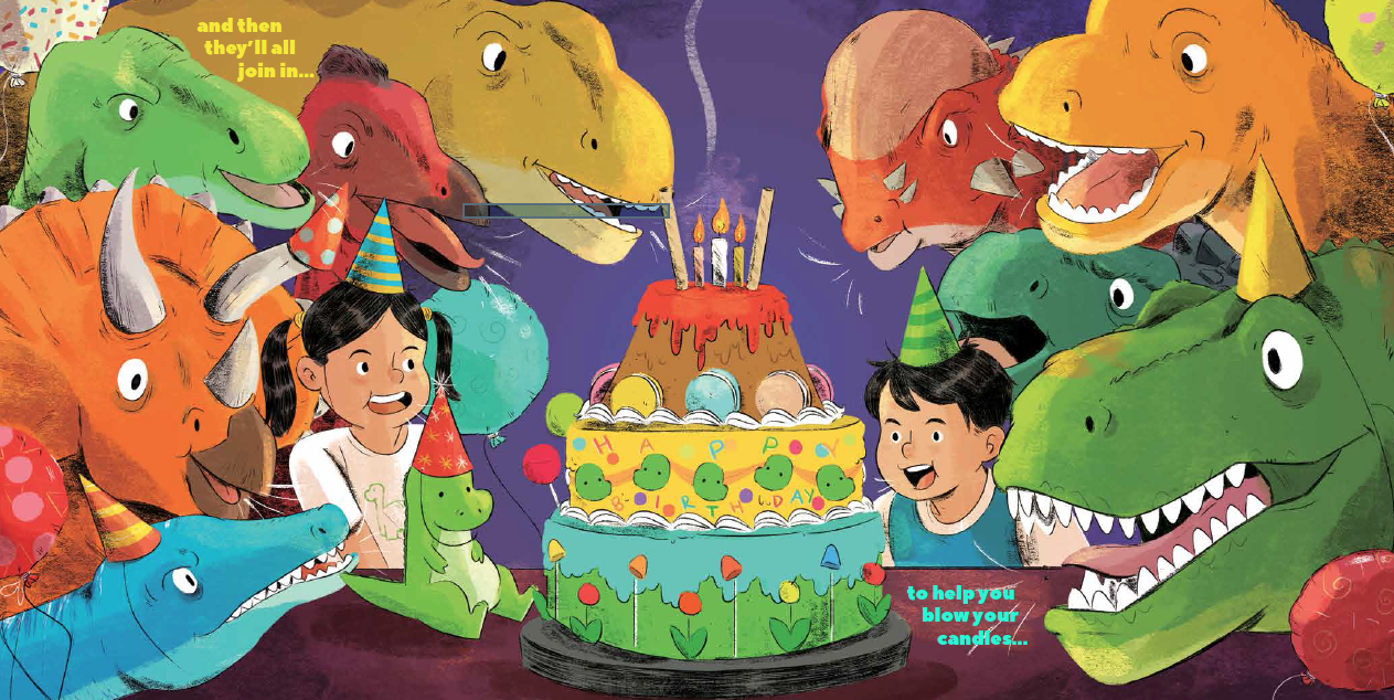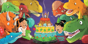 Don’t Ask a Dinosaur is about a party that goes wildly awry when a pack of dinosaurs with very unique physical attributes attempt to help set up a birthday party!