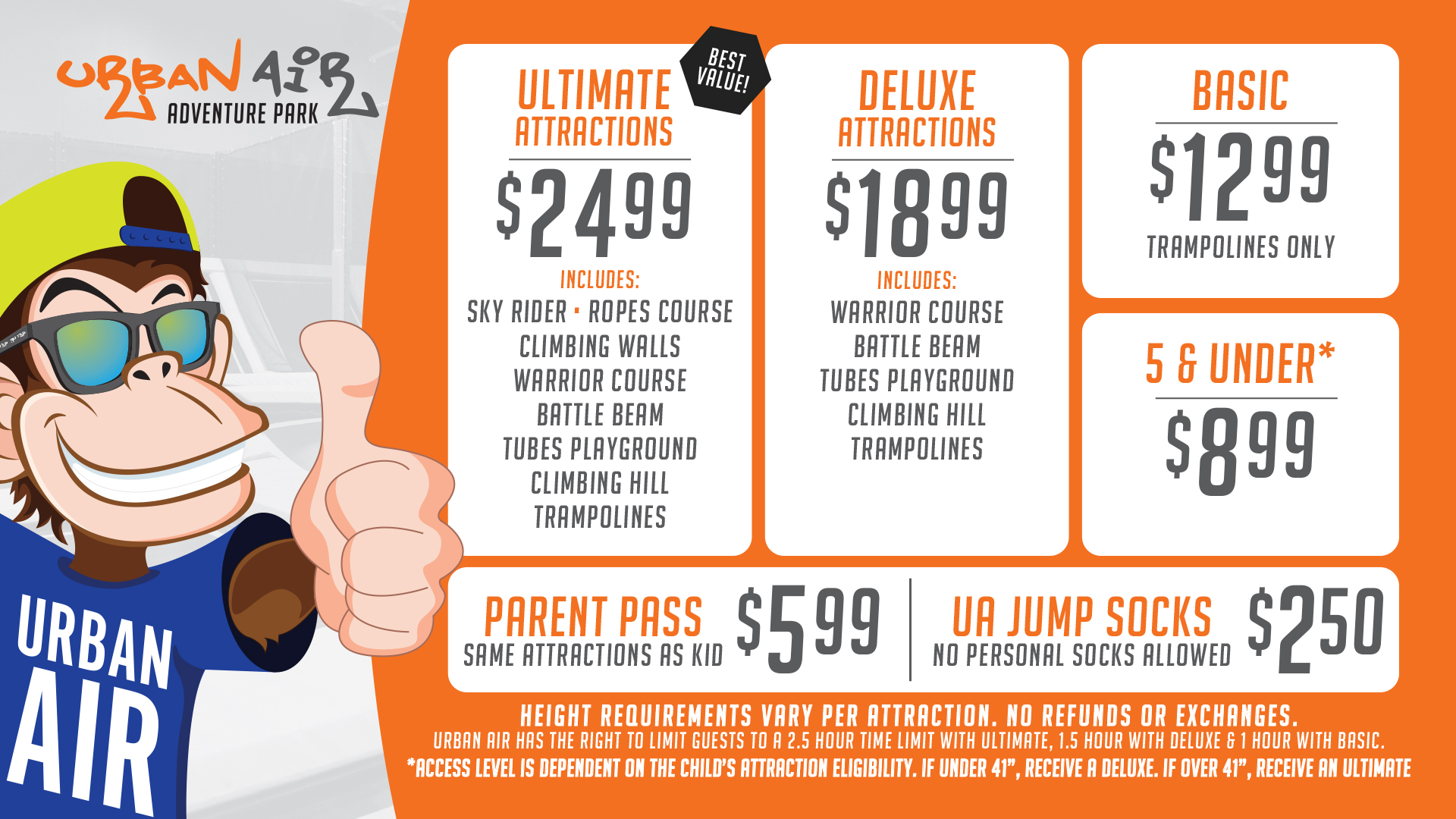 Urban Air is the premier full-service family entertainment center offering more than 30,000 square feet of adventure park attractions, as well as nine private rooms and plenty of reserved seating for group events and birthday parties.
