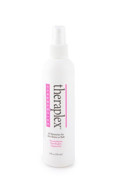 - If your child has been in the ocean or pool, rinse chlorine or salt off with a gentle cleanser and immediately apply a moisturizer such as Theraplex ClearLotion. A light, fast penetrating emollient oil spray, ClearLotion has earned the National Eczema Association Seal of Acceptance. When applied to damp skin, it uniquely wraps around water on the skin’s surface, sealing in moisture and replacing the natural oils that water and soap can strip away. After towel drying, ClearLotion leaves skin moisturized for hours without greasiness. And, because ClearLotion is a spray, you will be able to apply it to even the wriggliest of children!