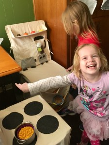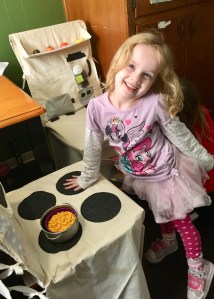 Ever visit a Pop Up shop? It’s the latest retail craze of temporary physical space to create a long term, lasting impression. My older girl just had a Pop Up Art Show at her school and it was so much fun! Imagine the same concept in the home as preschoolers play with a pop up kitchen that disappears when play is done. Say hello to Pop-oh-ver, the clever brand of durable and detailed kitchen play sets that assemble in two minutes over a sturdy household chair! I was actually thinking, “Boy, why didn’t I think of that?!?!” I’m not a stranger to large and clunky play sets for kids that tend to over take your house! As my girls get older, I have the experience to seek out toys that can fit seamlessly into your space that also invokes hours of imaginative play.