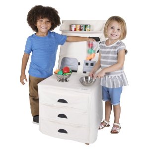 This portable kitchen set inspires endless play. Just fasten the counter top set over a chair, tie the ties and like magic you have a place to fix your food anywhere you want it. The canvas-like material boasts a toaster, scale and drawer detailing and a pop out shelf that actually holds items!