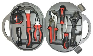 - Fiberglass Hammer, 10 Ft Retractable Tape Measure, Adjustable Wrench, Adjustable Pliers, Flat Nose Pliers, LED Aluminum Flashlight, Phillips and Flat Head magnetic tip screwdrivers, Plastic Carry Case
