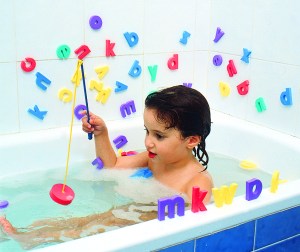 Fish N Spell makes bath time a letter game as toddlers go fishing for letters for hand eye coordination and letter recognition. Toss the “Wet and Stick” letters into the water, attach the bait, cast your line and see what you catch.Use your creativity along with your child’s to invent games to encourage hand eye coordination, creativity, team work and language and spelling skills.