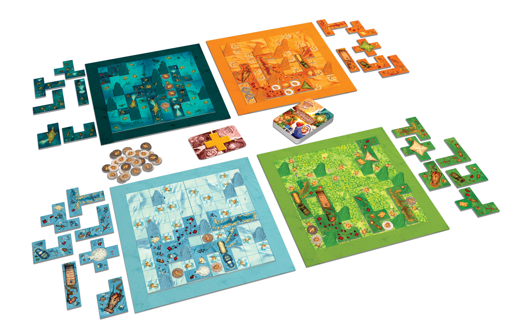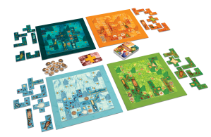 Scarabya is a tile-laying puzzle game designed by Bruno Cathala and Ludovic Maublanc, that includes unique gameplay and intricate components. By positioning pentomino tiles on individual boards, players create excavation zones of 1 to 4 squares that contain scarabs. The scarabs are then worth the size of the zone they are in.